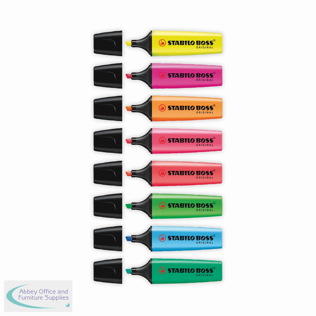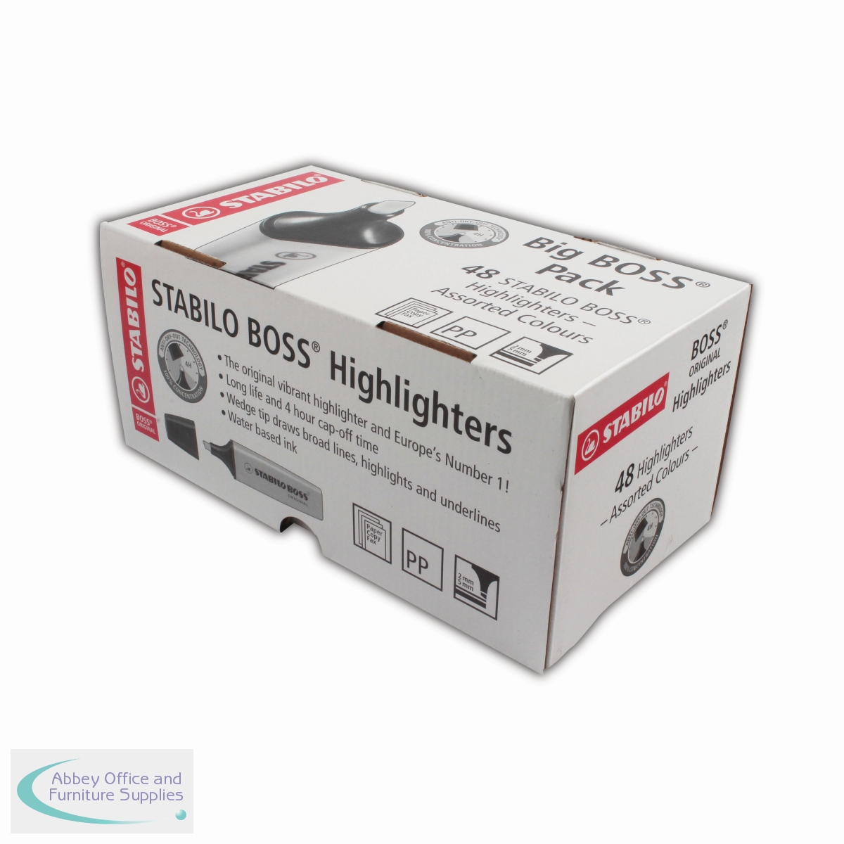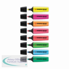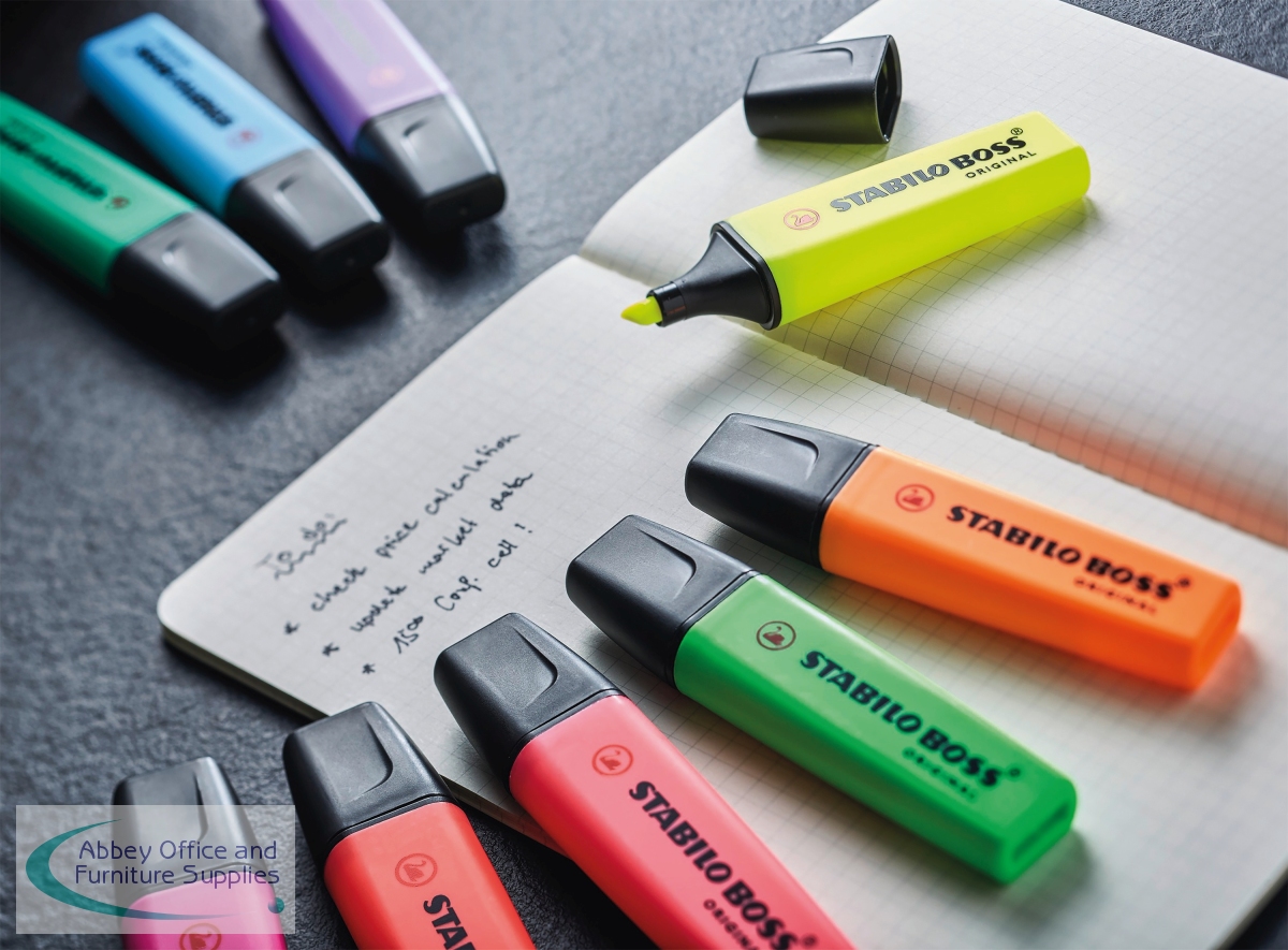 The Stabilo Boss Original is Europe's best selling, most popular highlighter. With its distinctive shape and ultra fluorescent colours, it is a high quality highlighter that writes further, lasts longer and will not dry out. The wedge shape tip can be used to draw broad and fine lines, making it perfect for highlighting, underlining text and even colouring. The Anti Dry Out Technology means the cap can be left off for up to 4 hours and the super bright colours will not fade. This pack contains 6 of each yellow, Green, orange, pink, blue, red, turquoise and lilac.