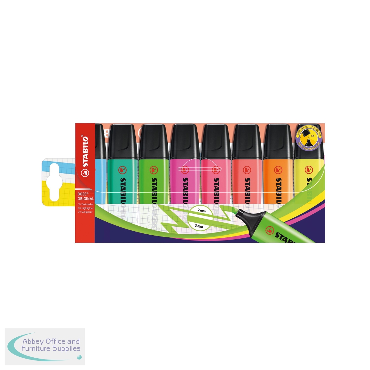The Stabilo Boss Original is Europe's best selling, most popular highlighter. With its distinctive shape and ultra fluorescent colours, it is a high quality highlighter that writes further, lasts longer and will not dry out. The wedge shape tip can be used to draw broad and fine lines, making it perfect for highlighting, underlining text and even colouring. The Anti Dry Out Technology means the cap can be left off for up to 4 hours and the super bright colours will not fade. This pack contains yellow, pink, orange, Green, blue, red, turquoise and lilac.