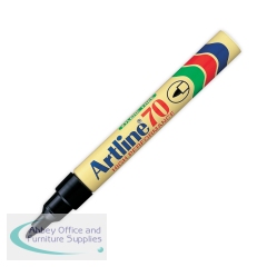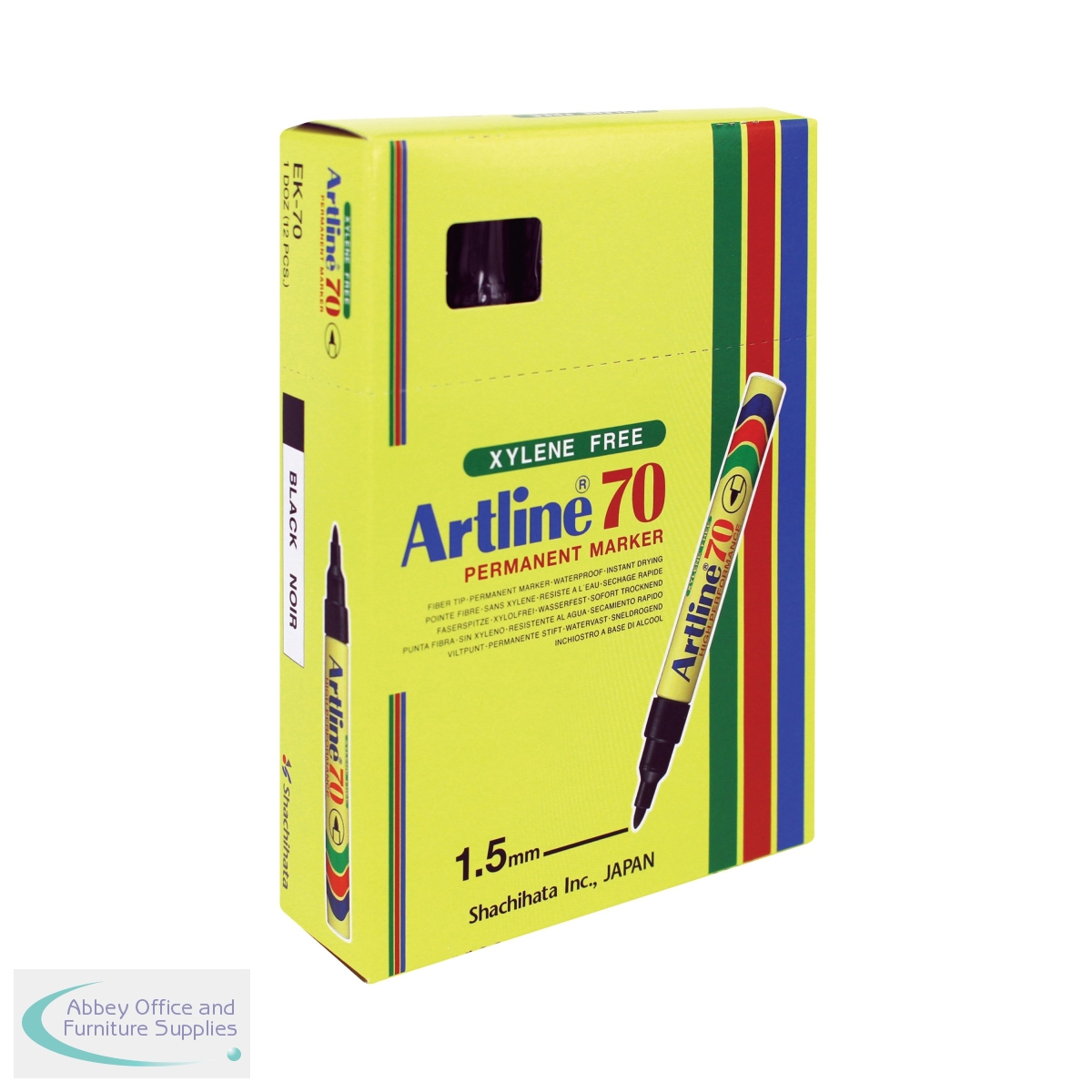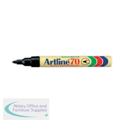 Designed for frequent use, this Artline 70 permanent marker features a heavy duty metal barrel and bullet tip for a 1.5mm line width. The fibre tip is suitable for marking a variety of surfaces, including glass, plastic, metal, rubber and porcelain. Ideal for bold, permanent marking, the water resistant ink is quick drying to prevent smudging. This pack contains 12 black markers.