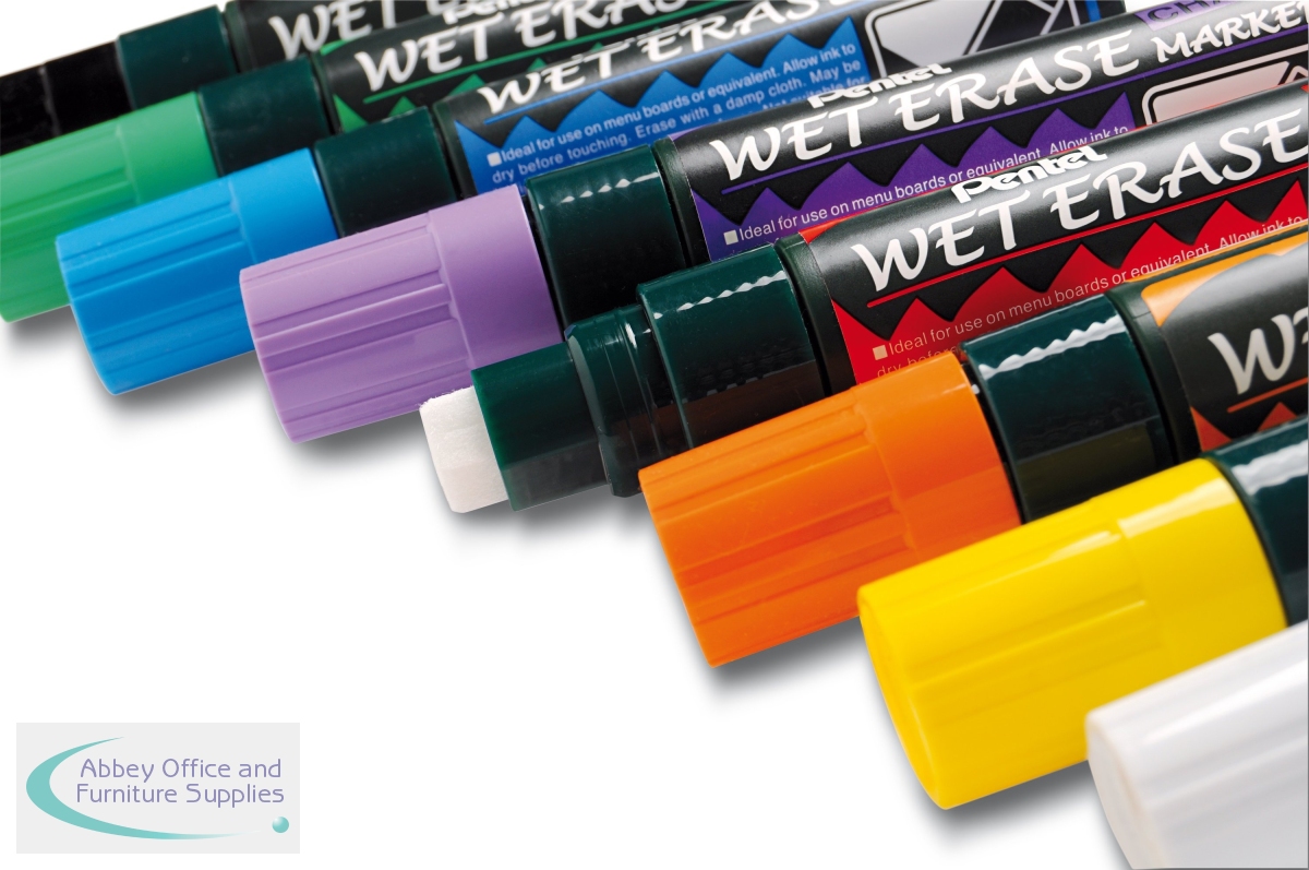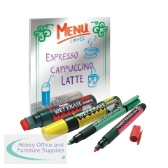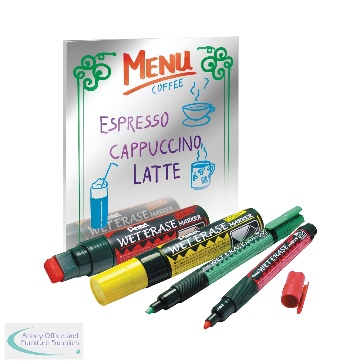 For use on conventional slate chalk board and glass these Pentel Markers contain liquid chalk which removes easily with a wet cloth. Suitable for both indoor and outdoor use the markers feature a valve action for a smooth controlled ink flow. Ideal for displays decorations menus information and more the jumbo chisel tip writes a variable line width of 10-15mm. This assorted pack of 4 chalk markers contains red yellow blue and white.