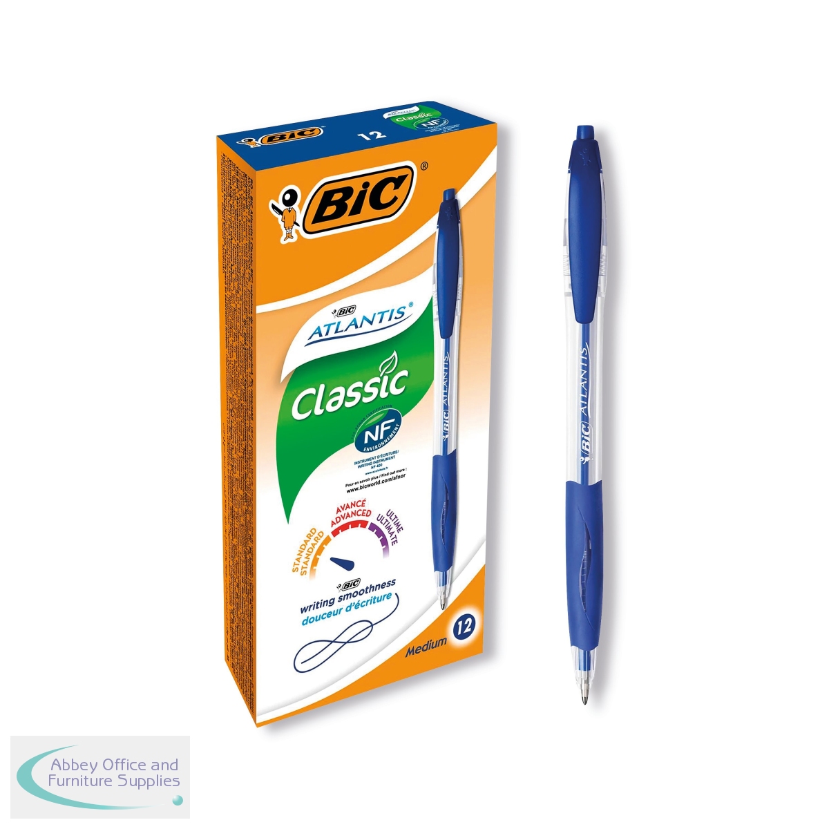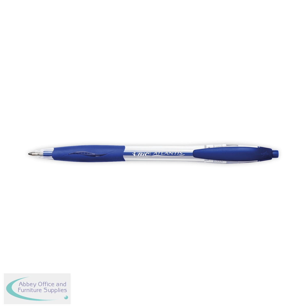 These Bic Atlantis Ballpoint Pens feature Bic Easy Glide ink for smoother, more consistent writing. The medium 1.0mm tip writes a 0.4mm line width, perfect for everyday handwriting. The retractable pen also features a stylish curved barrel for comfort in use. This pack contains 12 blue pens.