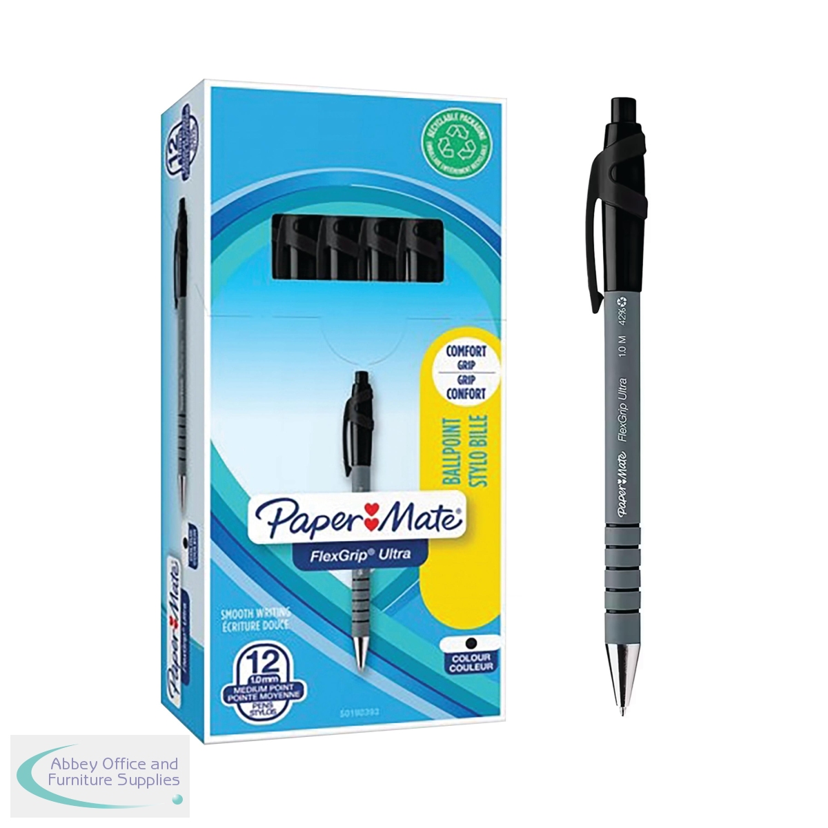 This pack of 12 PaperMate FlexGrip Pens with black ink provide a stylish and comfortable choice for business, school and home. With Lubriglide ink and a medium 1mm tip, they ensure smooth and bold lines whether drawing or writing. FlexGrip pens feature a rubberised barrel along the entire length for exceptional all-round grip and comfort throughout the day. The retractable mechanism protects the pen from damage when not in use and can be extended with the click of a button.