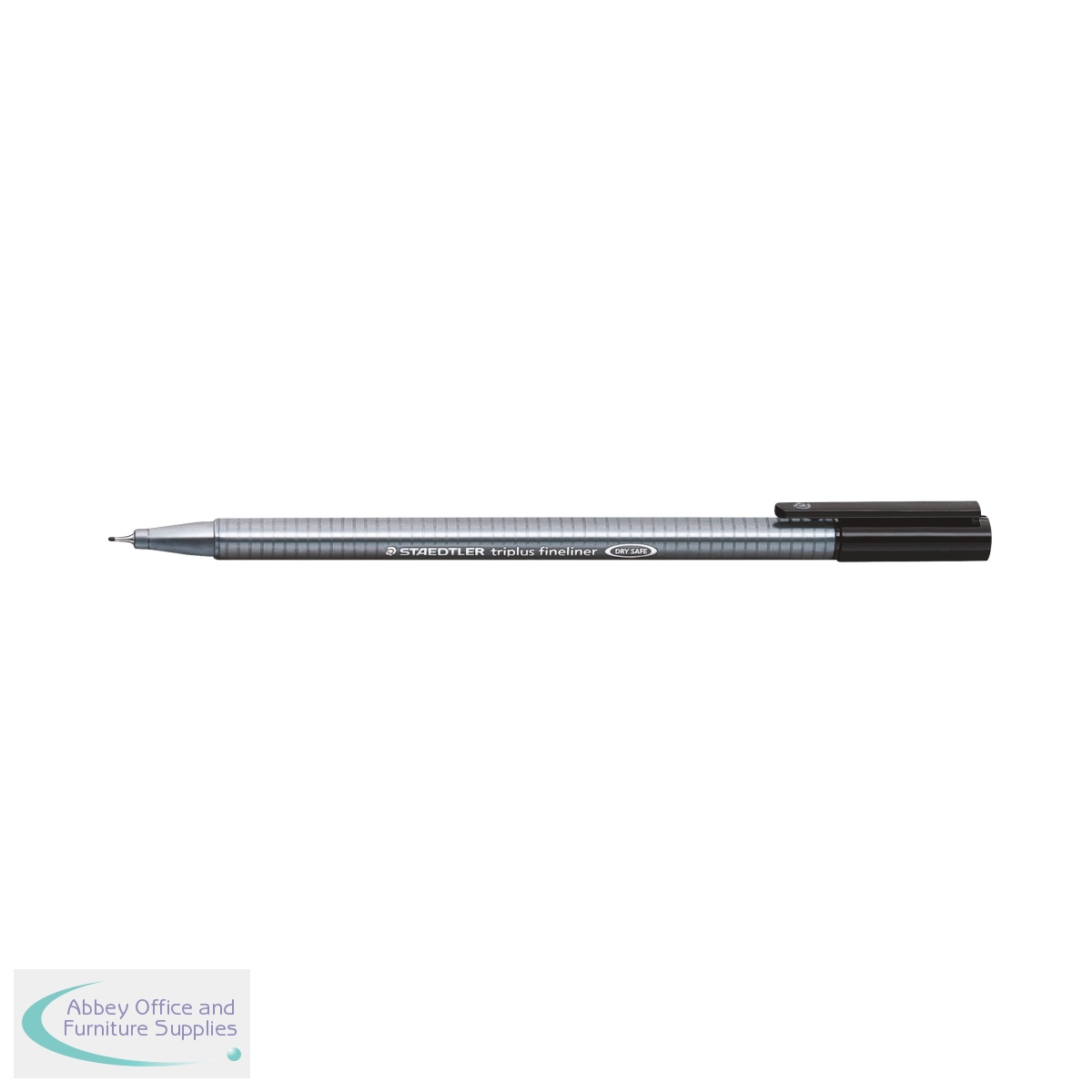 This ergonomically designed Staedtler Triplus Fineliner features a triangular barrel for comfortable writing and a metal-clad tip for durability. The water-based ink washes out of most textiles and is dry safe to allow the pen to be left uncapped for 2 days. The fine 0.6mm tip writes a 0.3mm line width for precise, controlled note-taking. This pack contains 10 black pens.