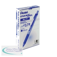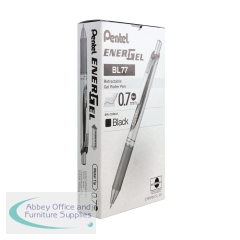 This Pentel EnerGel X pen features a transparent barrel with a soft rubber grip for comfort in use and a convenient retractable design. With revolutionary liquid gel ink the EnerGel formula is quicker drying and smoother flowing than ordinary gel ink giving a similar sensation to liquid ink. The 0.7mm tip writes a 0.35mm line width for general use at home work or at school. This pack contains 12 pens with red ink.