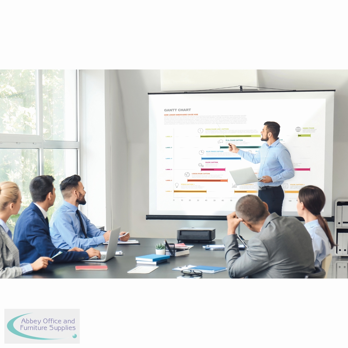 The flame retardant and mildew resistant screen can be adjusted for 4:3, widescreen or square projection formats. The design features an adjustable screen angle to eliminate the keystone effect from overhead projectors. The sturdy tripod base and matte white screen unfold in seconds, and when you are done it is just as easy to pack it back into the sturdy steel case. This product is wonderfully easy to use and boasts a square screen of 1250mm.