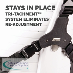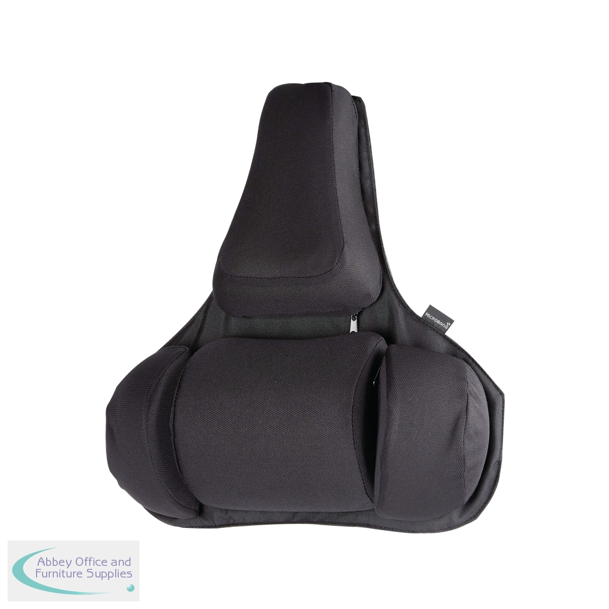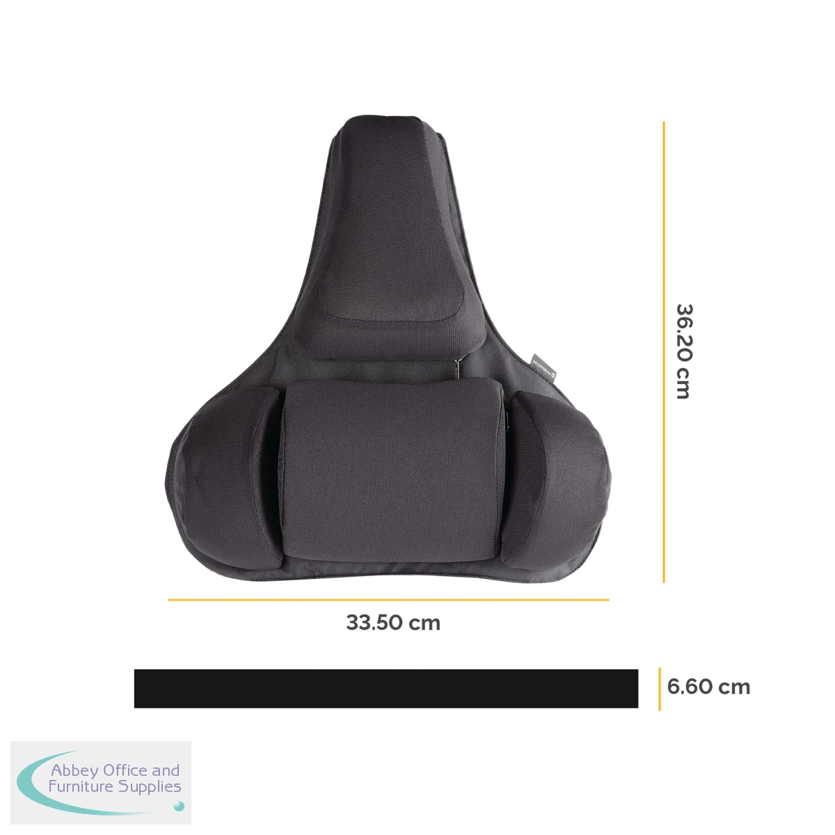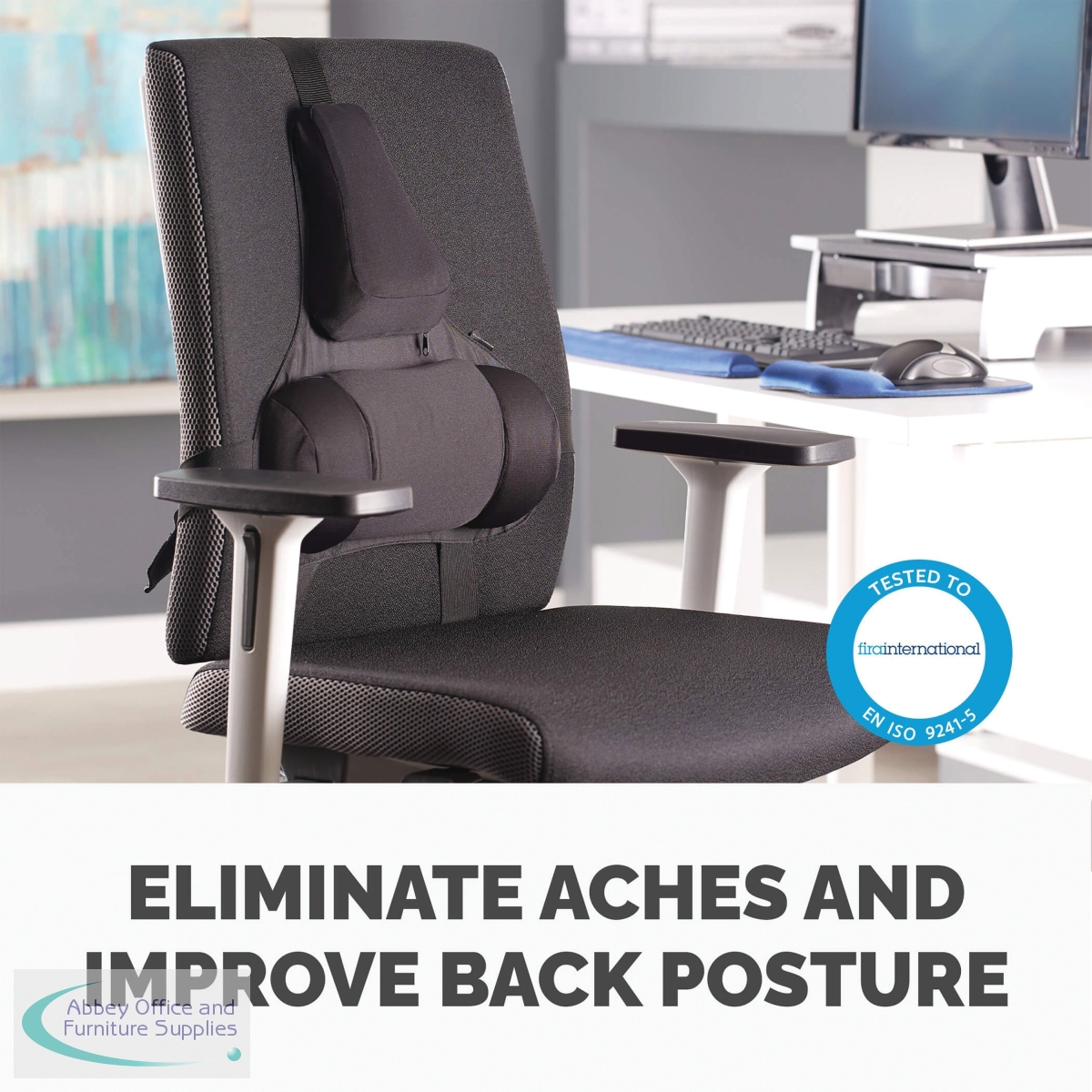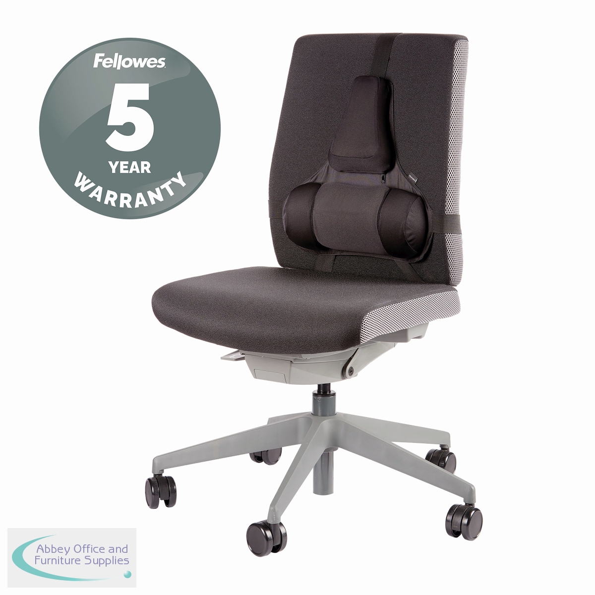 The Fellowes Professional Series Ultimate Back Support helps to reduce tension associated with extended desk work with a two tiered back support system. A mid spinal support with memory foam cushion promotes good posture and a lower lumbar support with three memory foam sections conforms comfortably to the body's natural curvature. Suitable for use on most chairs, this black back support also features a tri-tensioning attachment for a fixed position without the need to re-adjust.
