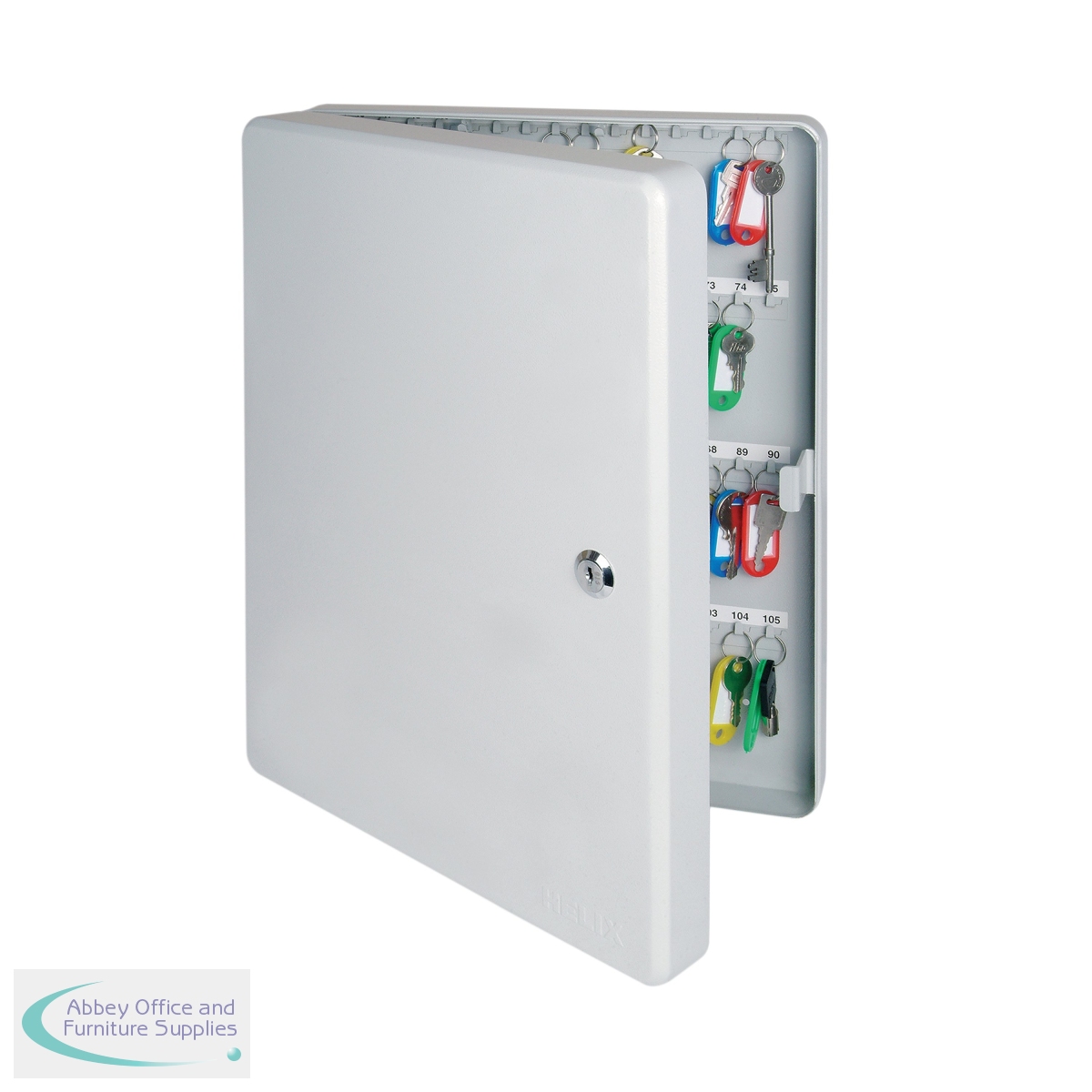 This Helix key cabinet is the ideal choice for keeping shared keys securely locked away in your business or organisation. Made from steel with a grey powder coated finish, the cabinet helps keeps your keys secure behind a cylinder lock supplied with two keys. Inside, there are metal key hanger strips that let you store up to 100 keys. Also supplied with index sheets, a key labelling kit and key fobs to help you organise your keys more efficiently. This key cabinet measures W315 x D70 x H400mm.