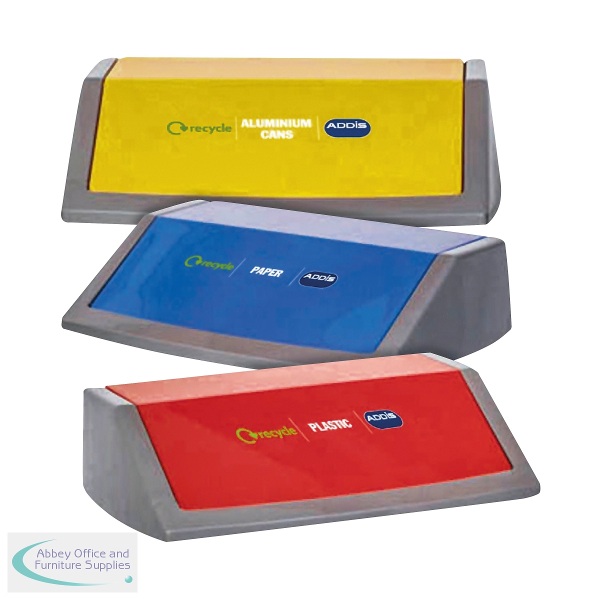 For an easy way to ensure recyclable materials are disposed of correctly, match this pack of three Addis Recycling Bin Kit Lids with Addis Recycling Bin Kit Bases (505574) for a comprehensive waste disposal system. These lids feature colour-coded swing lids with clear labels and an eye-catching Recycle logo. The kit includes red for plastic, yellow for aluminium cans and blue for paper recycling. The colour-coded system takes the guesswork out of correct recycling. (Image shows complete set of bins and lids).