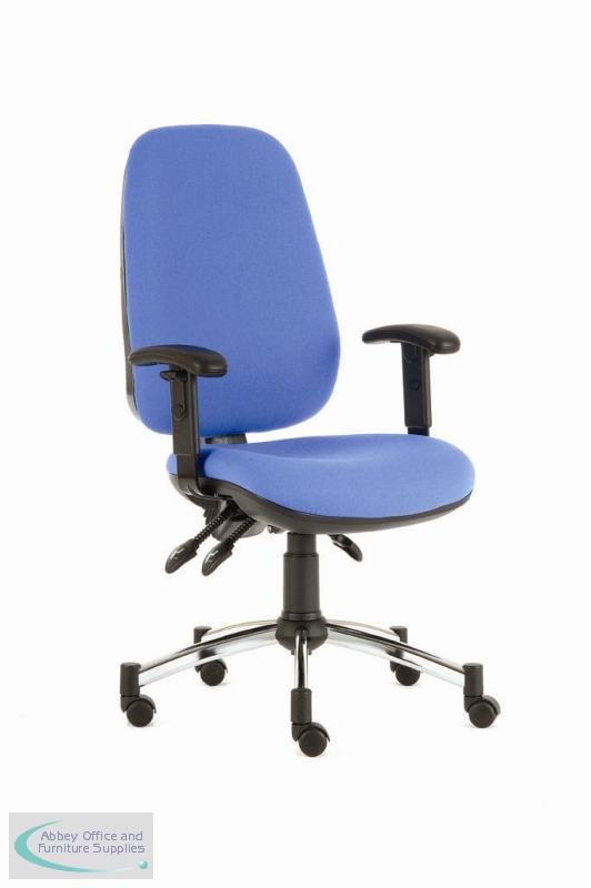 The Sara Executive has a three lever mechanism for independent adjustment of seat tilt, back angle and seat height. The chair also features height adjustable arms, concealed back height movement and a chrome base as standard. Seat and back proportions are high and wide, upholstery is contoured and deep. » Extra high and wide back Colourways in Stock