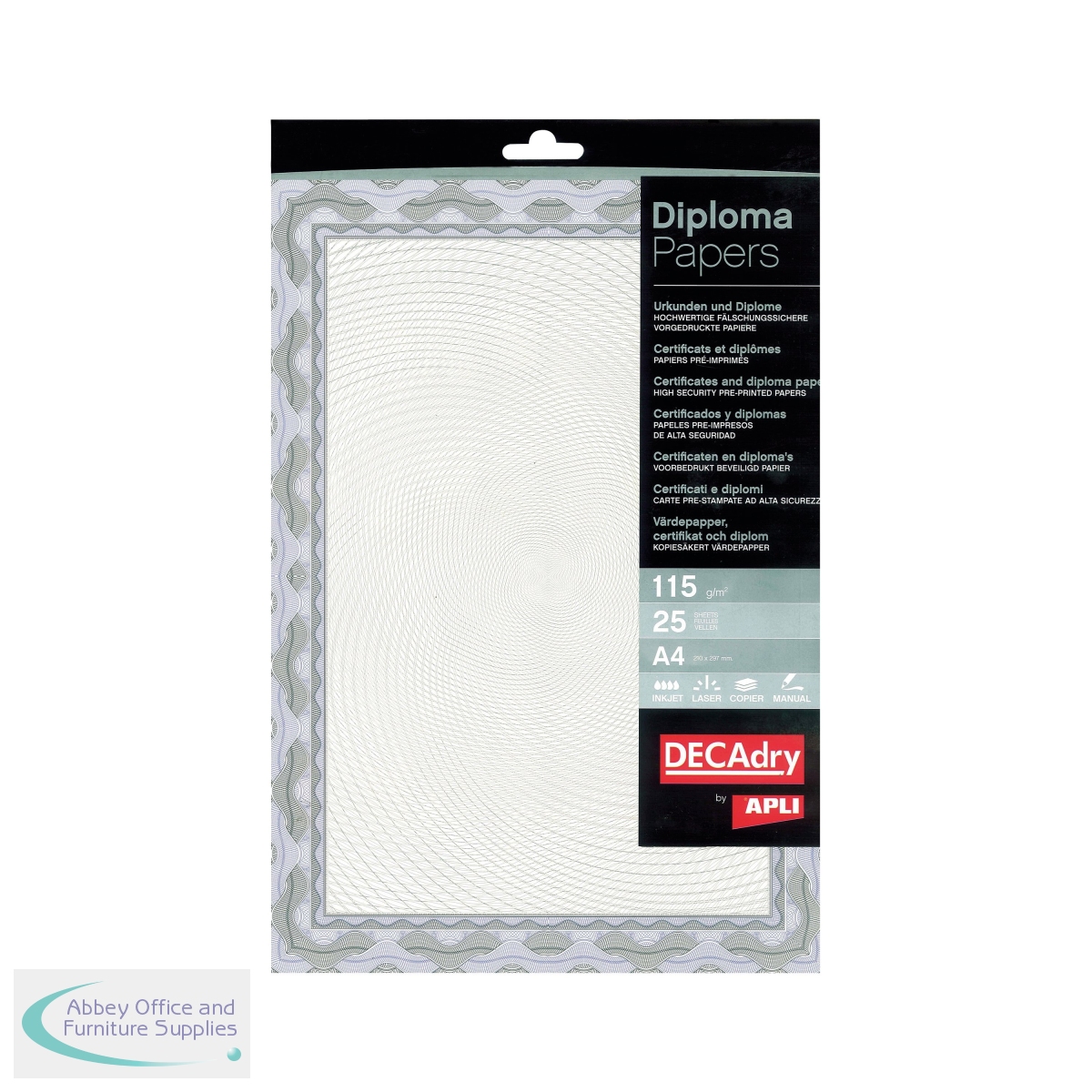 Made from luxurious heavy-weight paper manufactured with 25% cotton, Decadry Certificate paper is the perfect solution to creating professional quality certificates. Presented in a stylish blue spiral design, this paper is watermarked for security and provides a basis for sharp, high quality printing. Suitable for use with both laser and inkjet printers, as well as for handwriting, this certificate paper is 115gsm in weight and is supplied in a pack of 25 sheets.