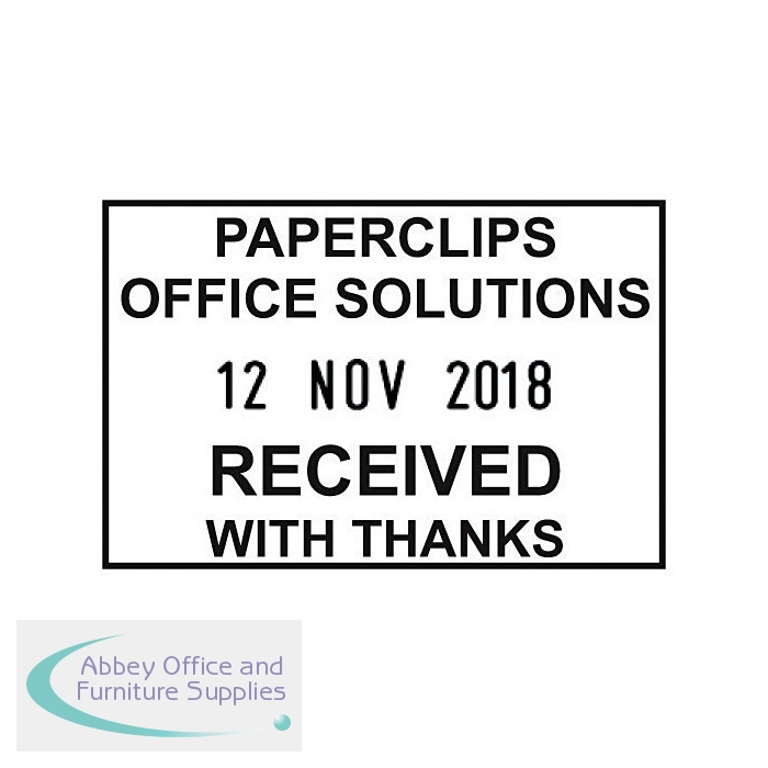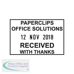 Create your own, customised self-inking stamp with this Q-Connect stamp voucher. The stamp combines a 4mm date with up to 4 lines of text with an impression size of W43 x H28mm. Design your own stamp online with a choice of text and graphics. This self-inking stamp provides thousands of impressions before re-inking is required.