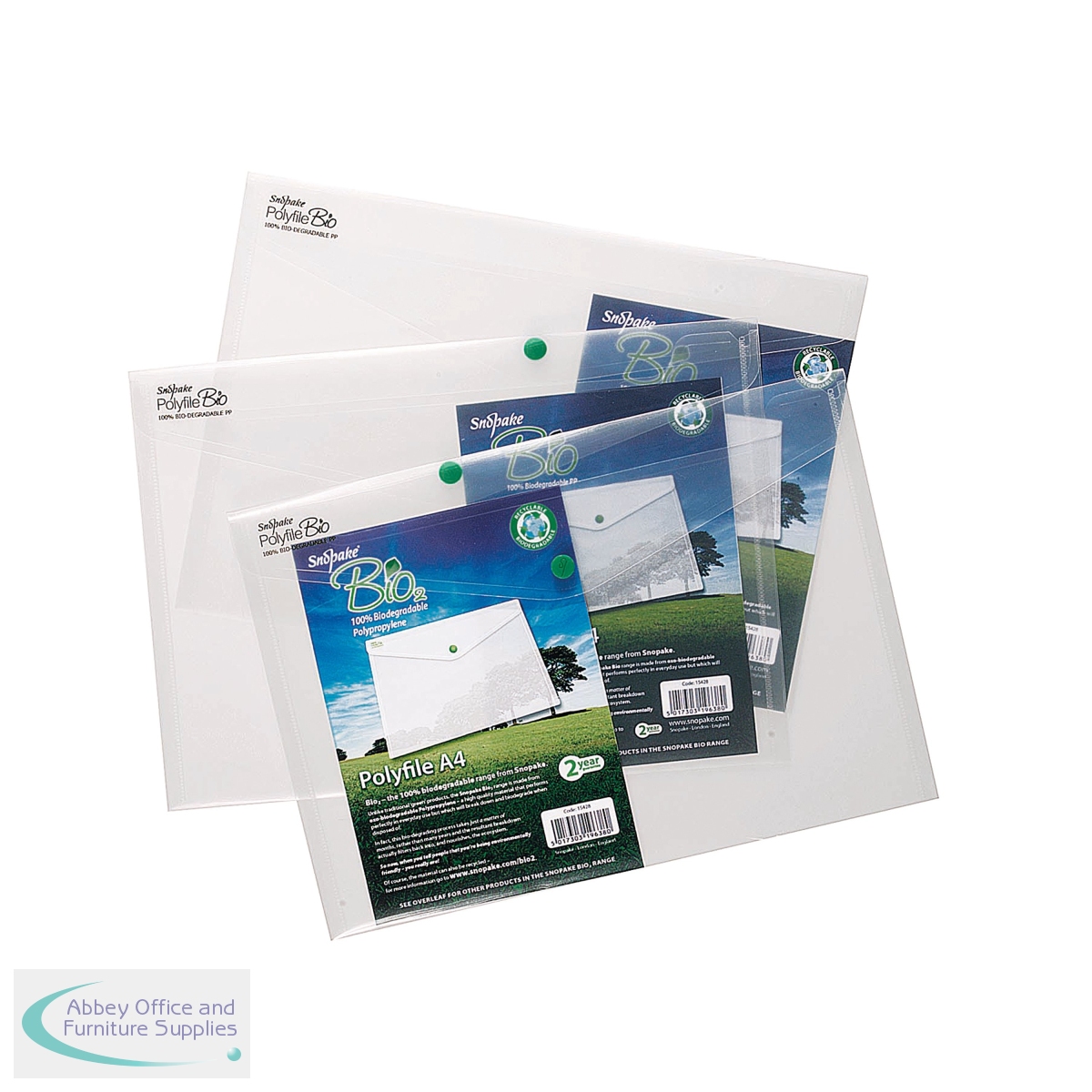 Part of the Snopake Bio range, this Polyfile is made from 100% biodegradable polypropylene. The durable 0.2mm thick polypropylene provides hard wearing protection for your documents with a green press-stud closure to keep contents secure. The clear frost embossed cover keeps contents visible. Each file can hold up to 150 sheets of 80gsm paper. This pack contains 5 clear A4 files.