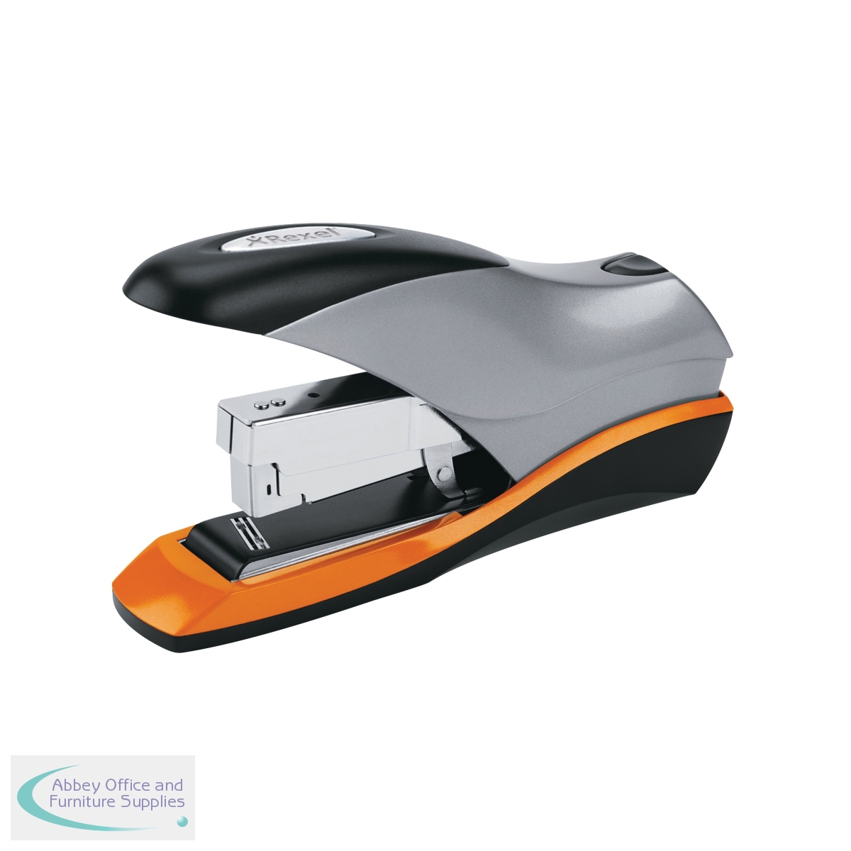 The Rexel Optima 70 stapler features a low force action for stapling up to 70 sheets of 80gsm paper. With a durable metal design and a throat depth of 68mm, the stapler has an easy to use, top loading mechanism for fast and simple refilling. It also offers jam-free, flat clinch stapling with up to 50% less effort. It comes with a pack of 500 HD70 staples and has a stylish silver, black and orange design.