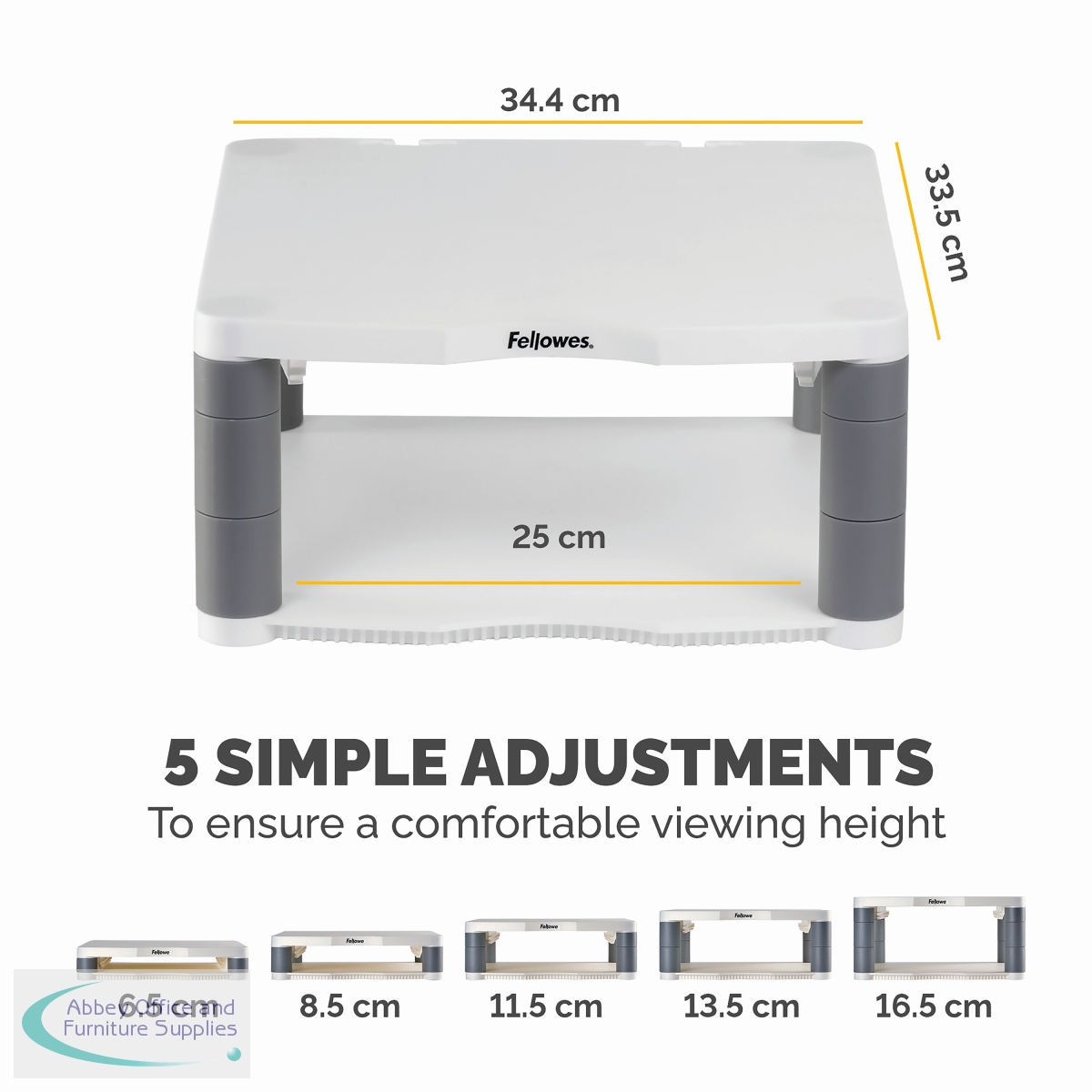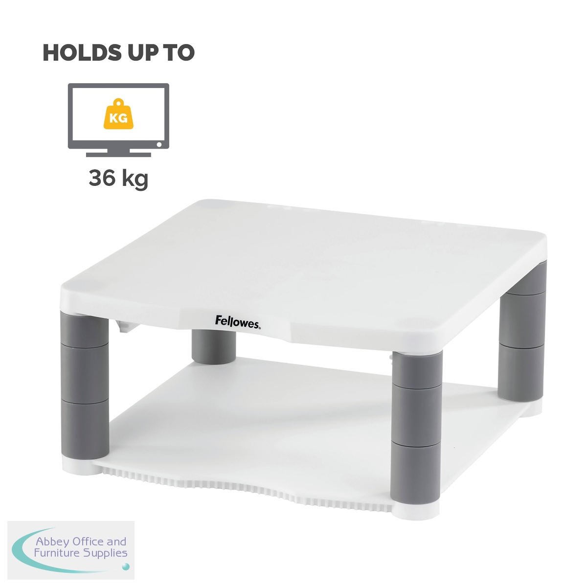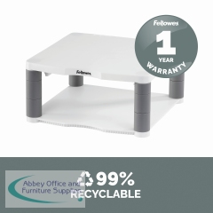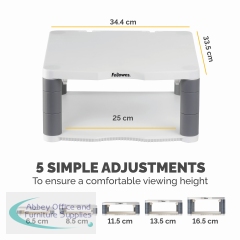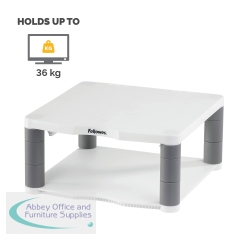 This Fellowes Premium Monitor Stand features 5 height adjustments from 64mm to 165mm with simple to use stacking columns for maximum viewing comfort. The sturdy plastic base can also be used for storage of paper, stationery or other accessories. This Stand has a maximum weight capacity of 36kg for CRT or TFT/LCD monitors and comes in Platinum.
