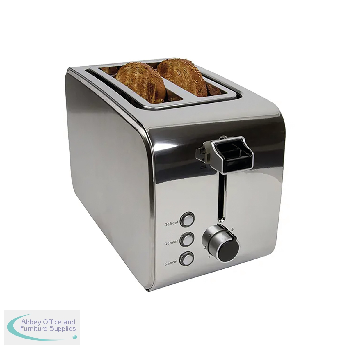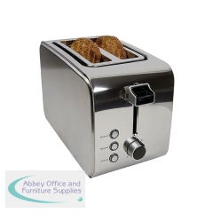 This 2 slice stainless steel toaster features an adjustable heat level and a removable crumb tray for easy emptying. The toaster also features defrost, cancel and re-heat functions, with self-centring guides and an anti-jam auto shut off.
