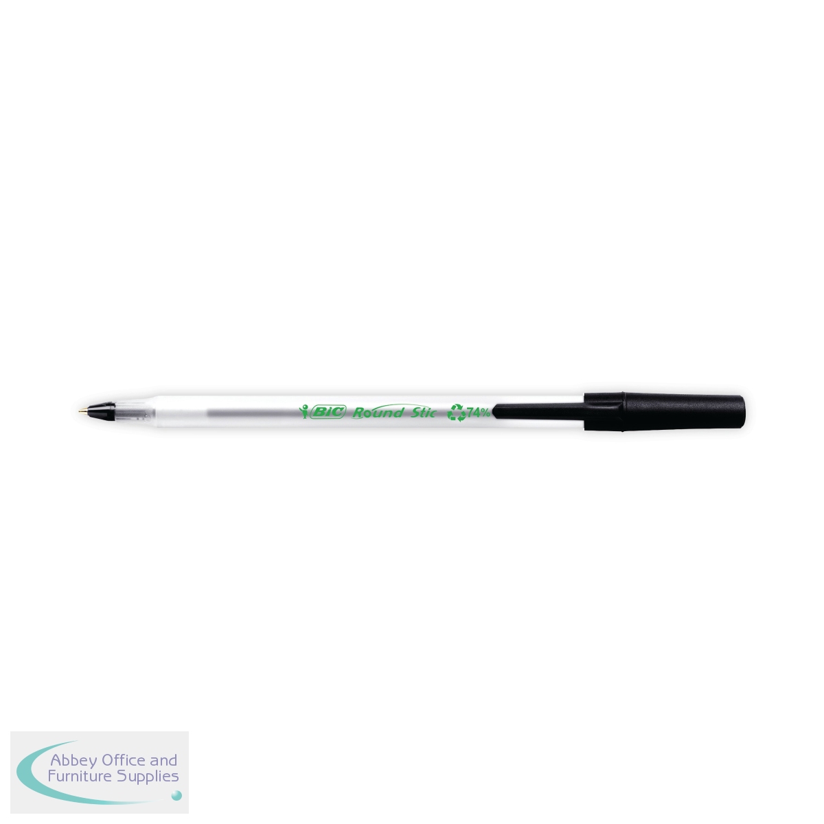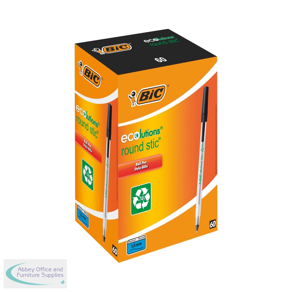 Bic Round Stic ECOlutions is a high quality, environmentally-friendly ball point pen for everyday use. It features an attractive slim-line barrel made with translucent plastic, including a clip for pocket storage, and quality black ink for a smooth line. The medium 1mm tip provides a line width of 0.4mm, ideal for general handwriting use. The eco-friendly design includes 74% recycled material by weight for a more environmentally friendly ball point pen. This pack contains 60 pens.