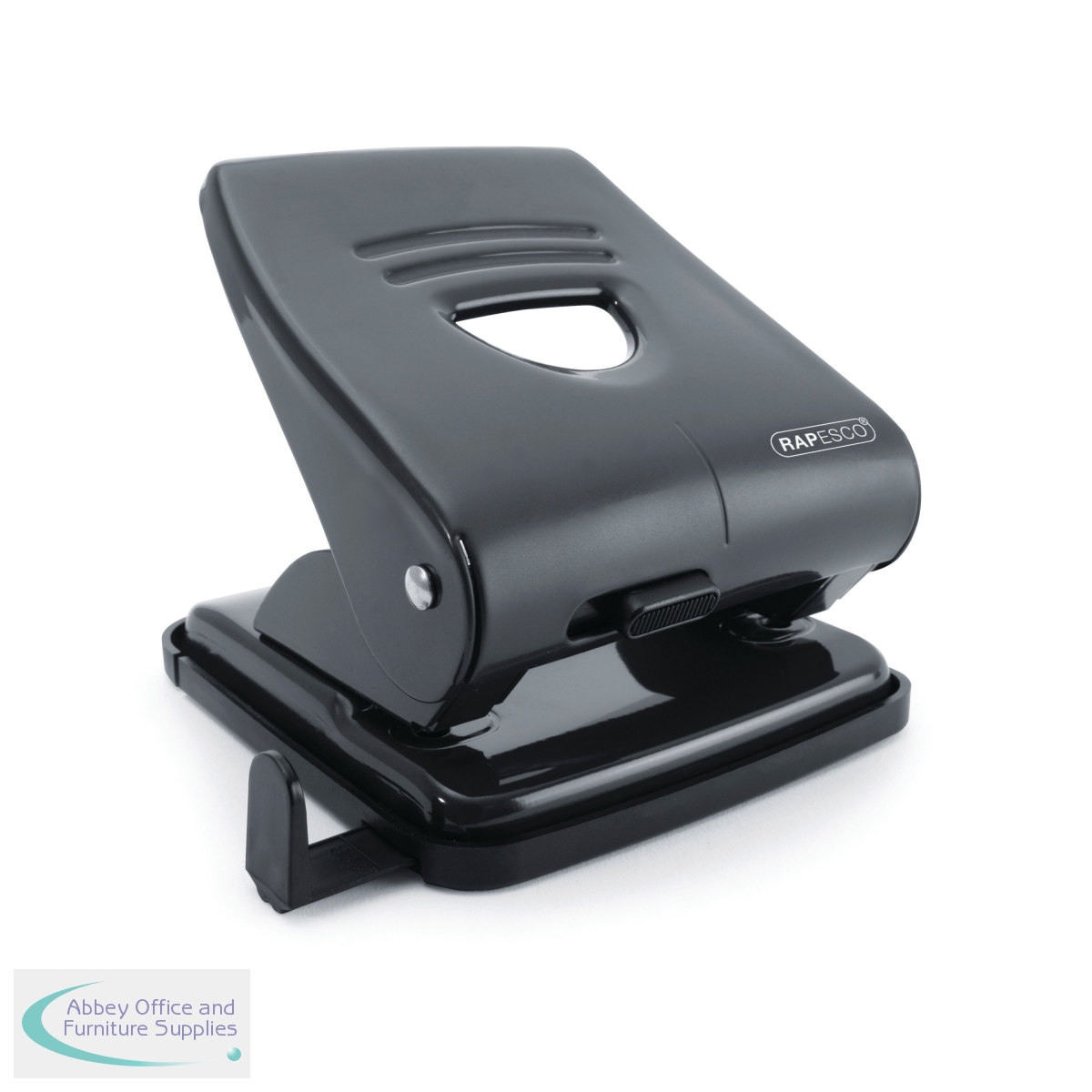 The Rapesco 827 is an all metal 2 hole punch with a punching capacity of up to 30 sheets of 80gsm paper. The handle locks down for storage and the flip open confetti tray is easy to empty. This black hole punch also features an adjustable paper guide for precision.