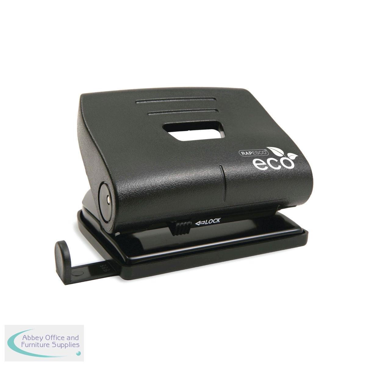 Part of the Rapesco Eco range, this durable, environmentally friendly 2 hole punch features all metal workings, with a 100% recycled ABS handle and can punch up to 22 sheets of 80gsm paper. With a handle lock down switch for easy storage, the black hole punch also features an adjustable paper guide for accuracy and a flip open confetti tray for easy emptying.