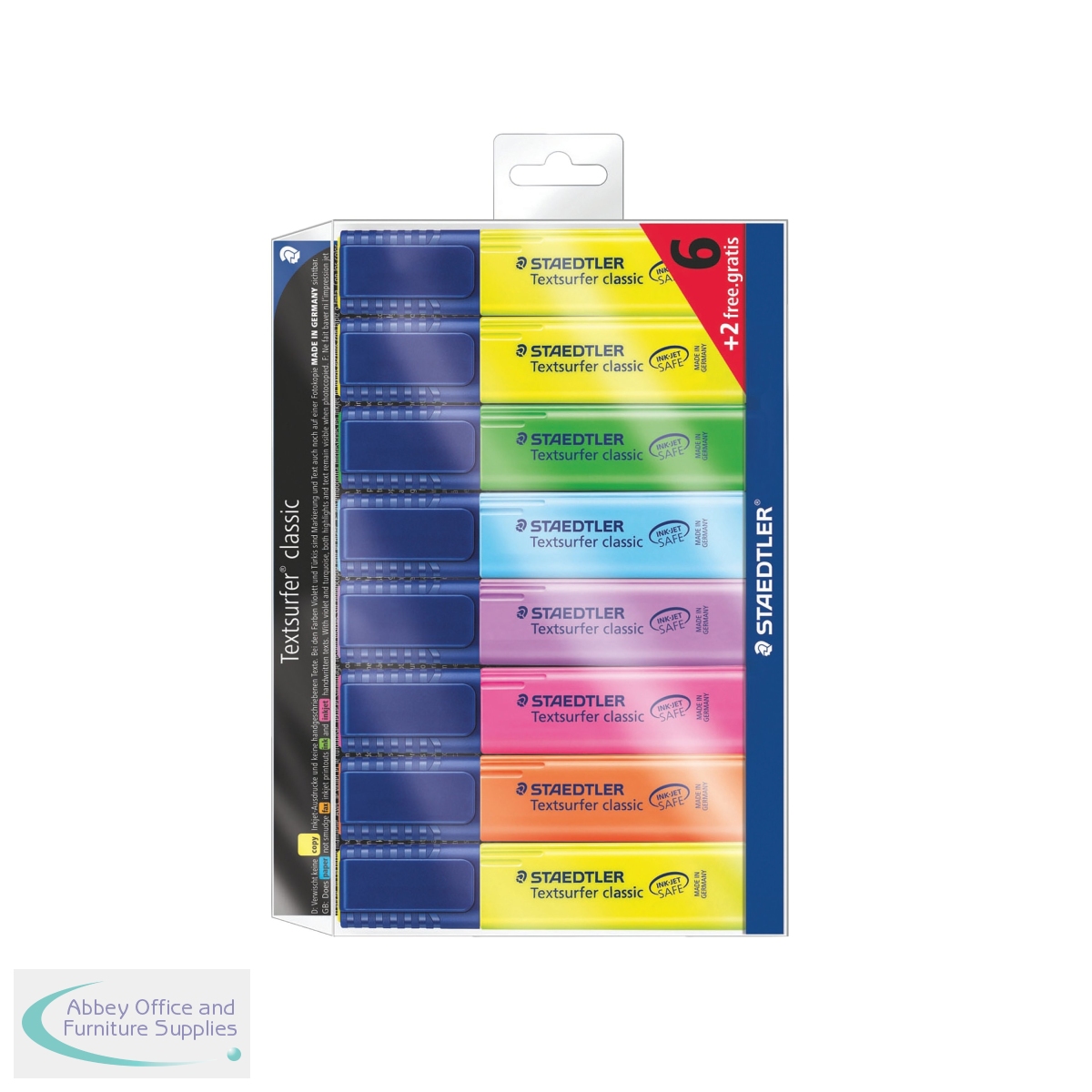 The Staedtler Textsurfer Classic is a fast-drying highlighter with a large ink reservoir for longer performance life. Ideal for use on paper, fax and copies without smudging inkjet yield or handwritten text. Fitted with a pocket clip and twist cap for your convenience, this highlighter is suitable for use in busy offices or at home. This pack contains 6 highlighters in assorted colours (yellow, orange, pink, green, violet and turquoise) with an extra 2 yellow highlighters free.
