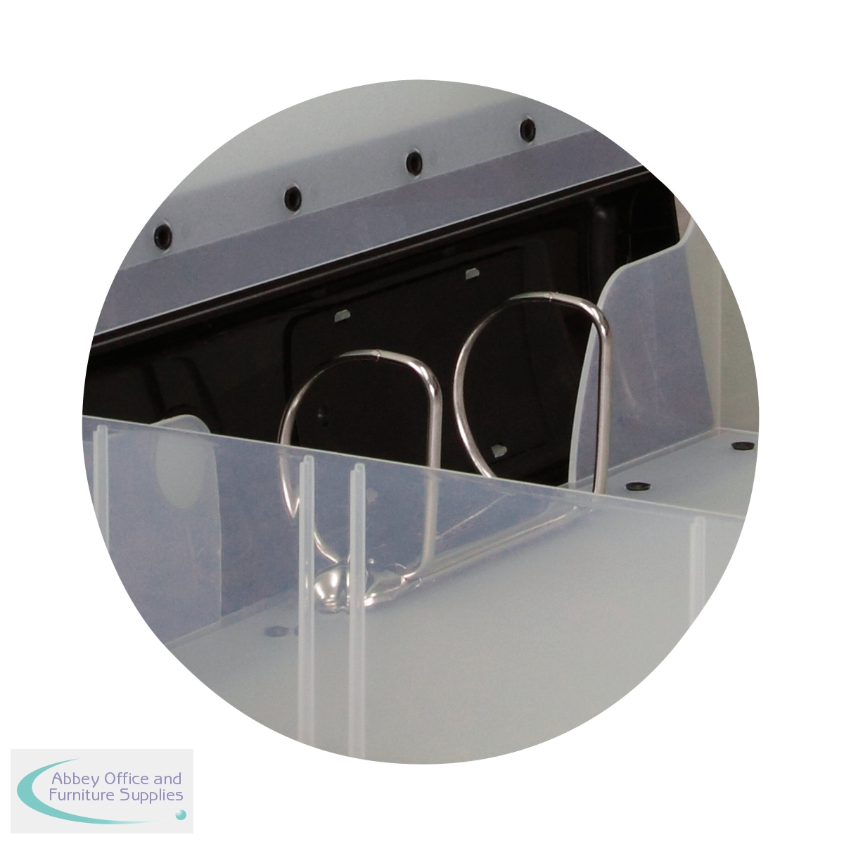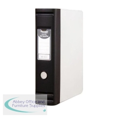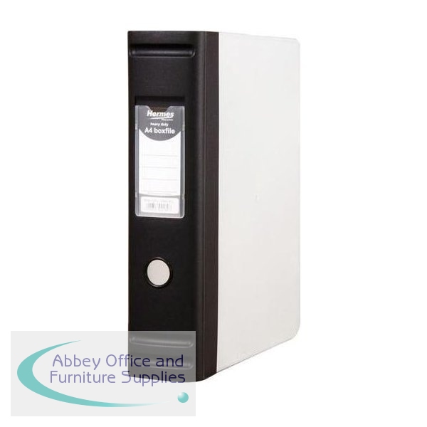 This Hermes box file is made from heavy duty polypropylene for long term filing of A4 documents. The box file features a unique 2 D-ring filing mechanism with a 50mm capacity for up to 500 sheets of 80gsm paper. The file also features a coloured 80mm spine with a finger ring for easy retrieval from a shelf and a removable spine label. This pack contains 1 black box file measuring W80 x D290 x H325mm.