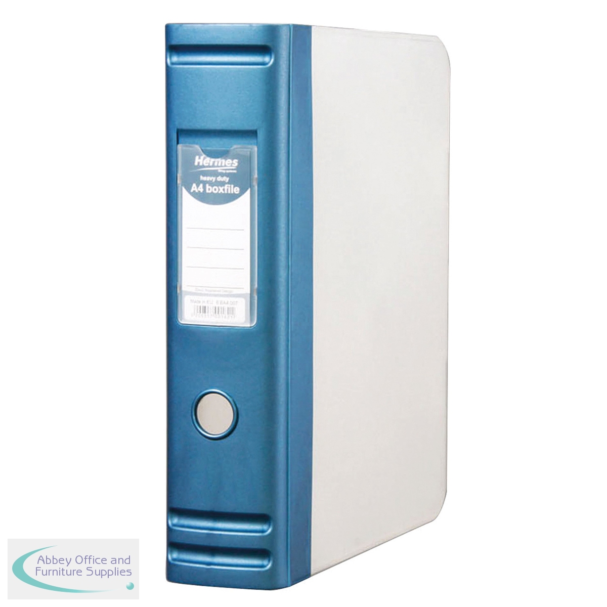 This Hermes box file is made from heavy duty polypropylene for long term filing of A4 documents. The box file features a unique 2 D-ring filing mechanism with a 50mm capacity for up to 500 sheets of 80gsm paper. The file also features a coloured 80mm spine with a finger ring for easy retrieval from a shelf and a removable spine label. This pack contains 1 blue box file measuring W80 x D290 x H325mm.