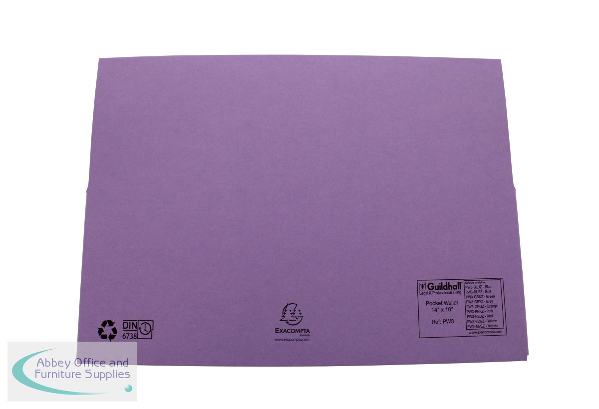 This Exacompta Guildhall legal wallet is made from premium quality 315gsm manilla and features a 35mm pocket, which can hold up to 180 sheets. Sized for legal briefs, each wallet measures 356 x 254mm (10 x 14 inches). This pack contains 50 mauve legal wallets, ideal for colour coordinated filing.