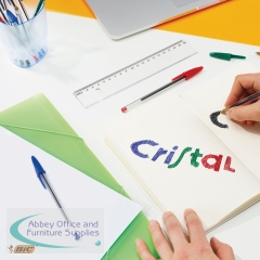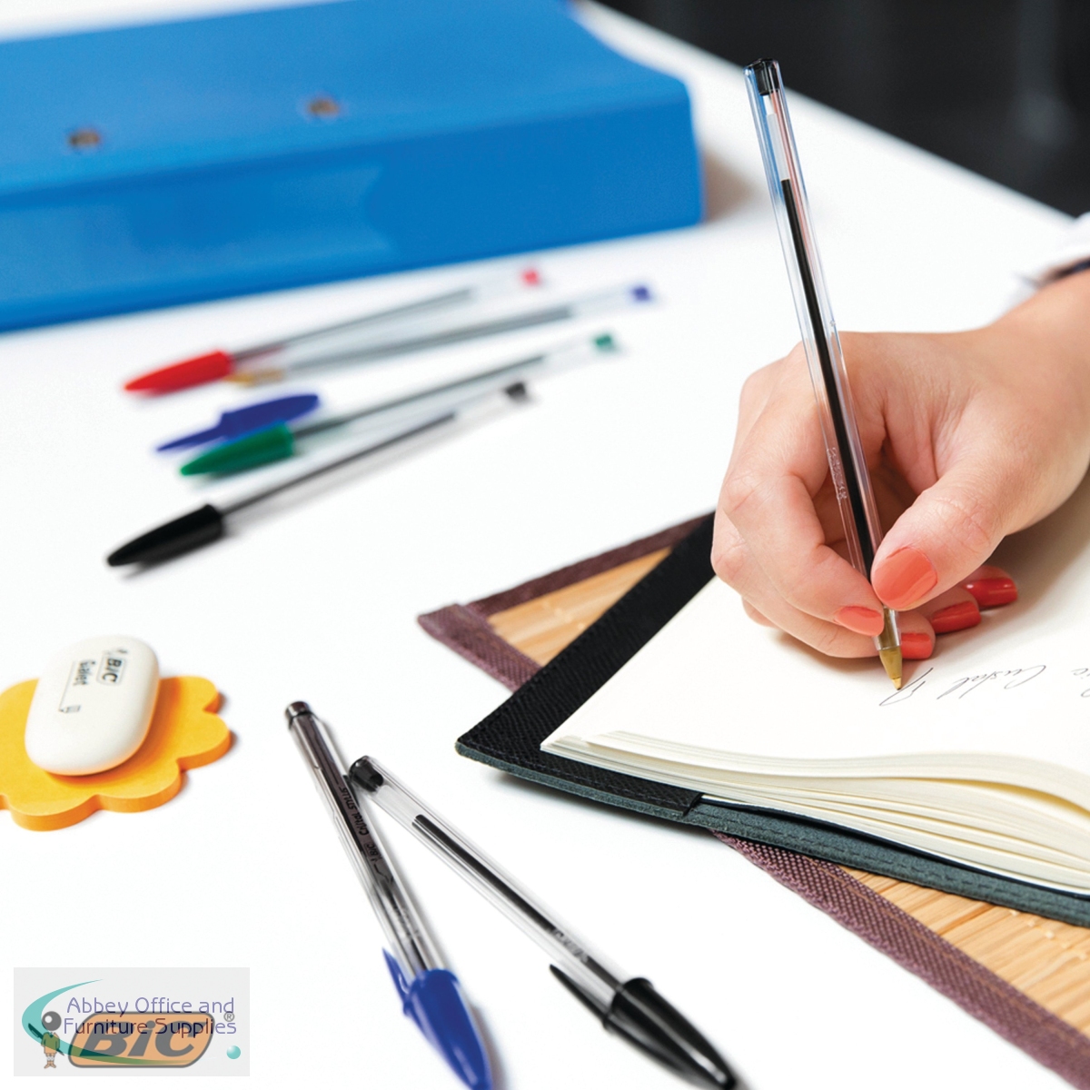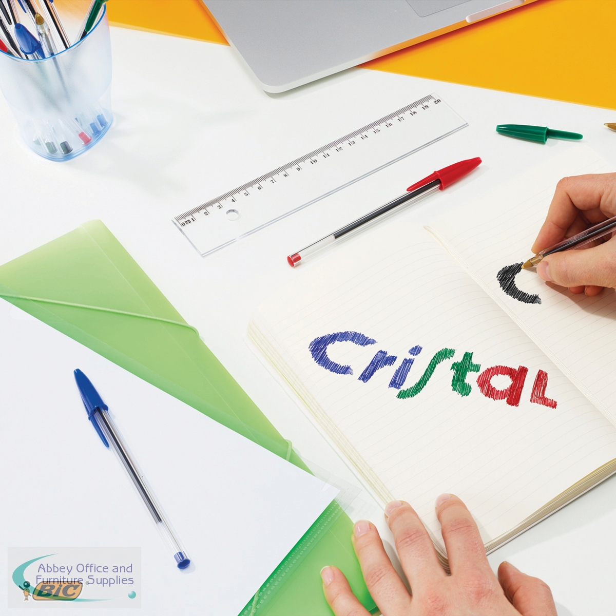 These Bic Cristal Ballpoint Pens feature a durable tungsten carbide ball mechanism and smooth oil-based ink for reliable, everyday use. The medium 1.0mm tip produces a thin 0.4mm line for elegant handwriting and detailed sketching. The hexagonal barrel includes a black cap and end plug that matches the ink for easy identification. This value pack contains 100 black pens.