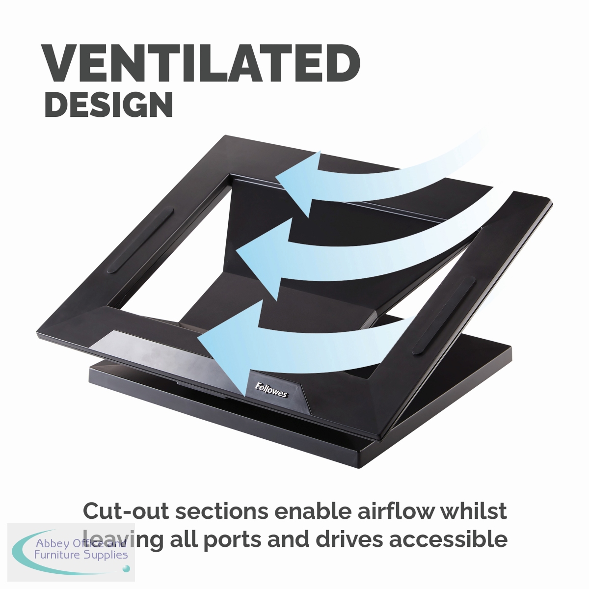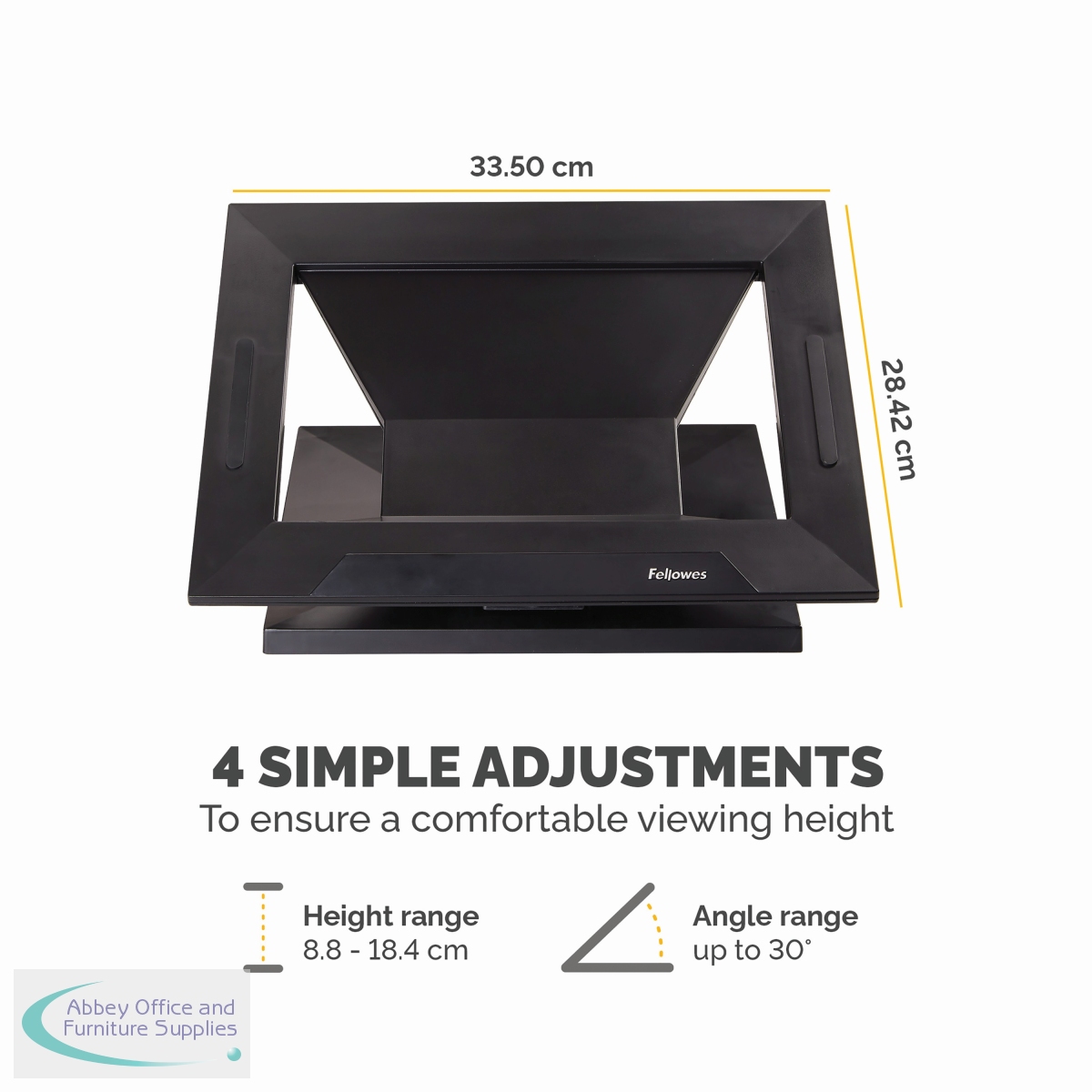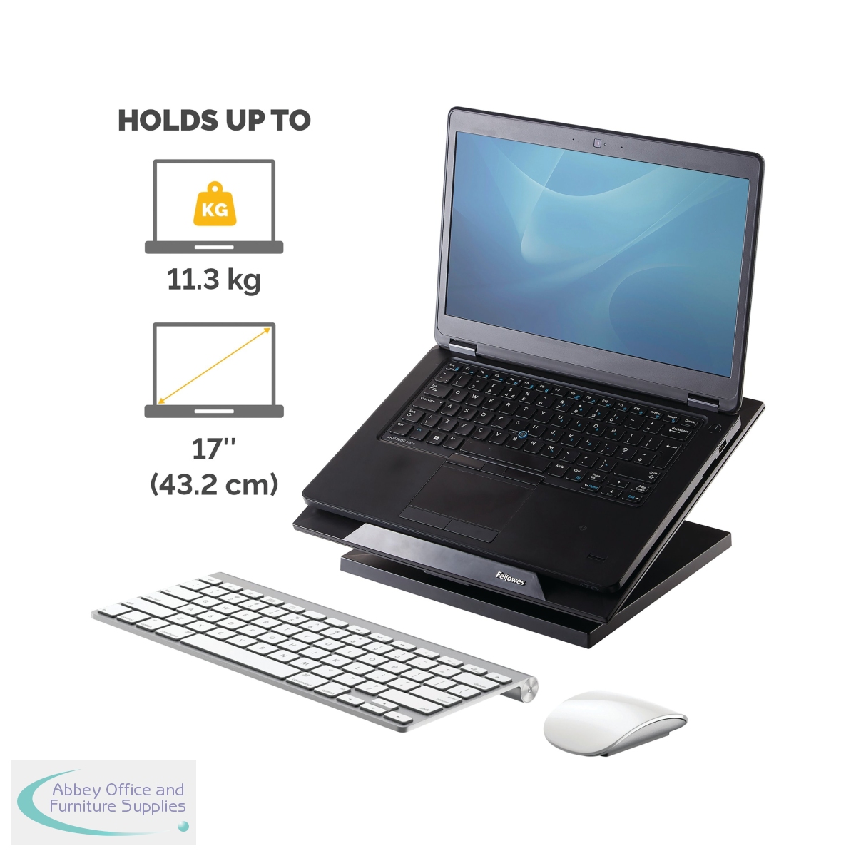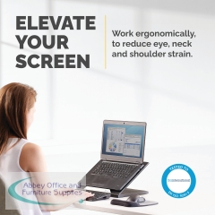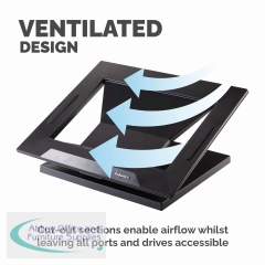 This Fellowes Designer Suites Laptop Stand is height adjustable with four positions from 88mm to 184mm and angle adjustable between 0 and 30 degrees, leaving you free to customise your viewing position for maximum comfort. The stabilising edge helps keep your laptop secure and the cooling vents help prevent overheating. Suitable for laptops up to 17 inches, this black laptop Stand has a maximum weight capacity of 11.3kg.
