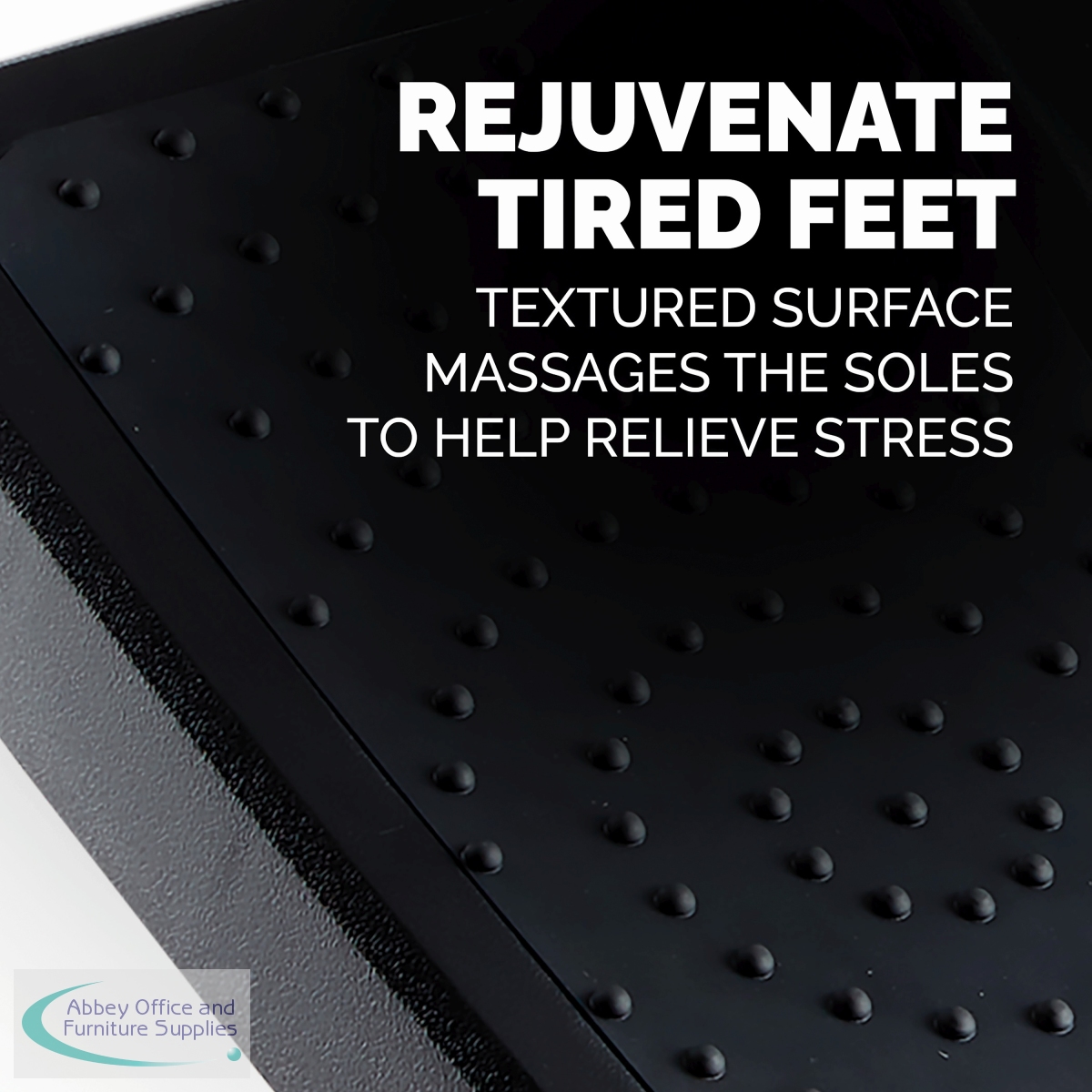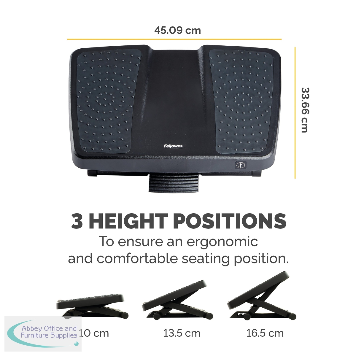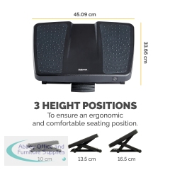 This Fellowes Professional Series Ultimate Footrest features an innovative scissor motion height adjustment with three platform height settings of 100mm, 135mm and 165mm. The foot support also features a massage surface and rocking motion to aid comfort and circulation.
