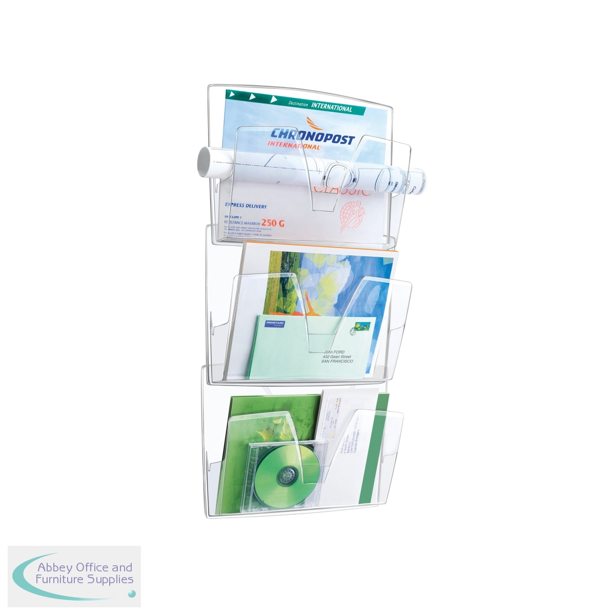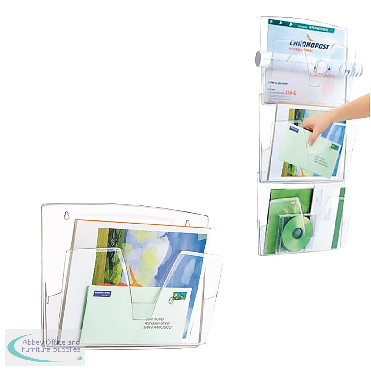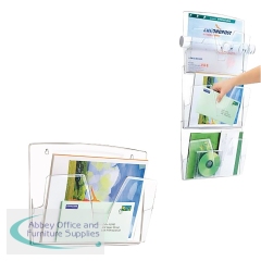 In crystal clear plastic and with cutaway fronts and sides to allow easy access to contents, these CEP wall files are both useful and stylish. Supplied with all necessary fixings, they can be individually attached to the wall or can be set up to hang from each other. 100% recyclable, the wall files accept documents up to 240x320mm in size, and the cutaway sides allow for the storage of postal tubes and larger envelopes. Supplied in a pack of 3 files.