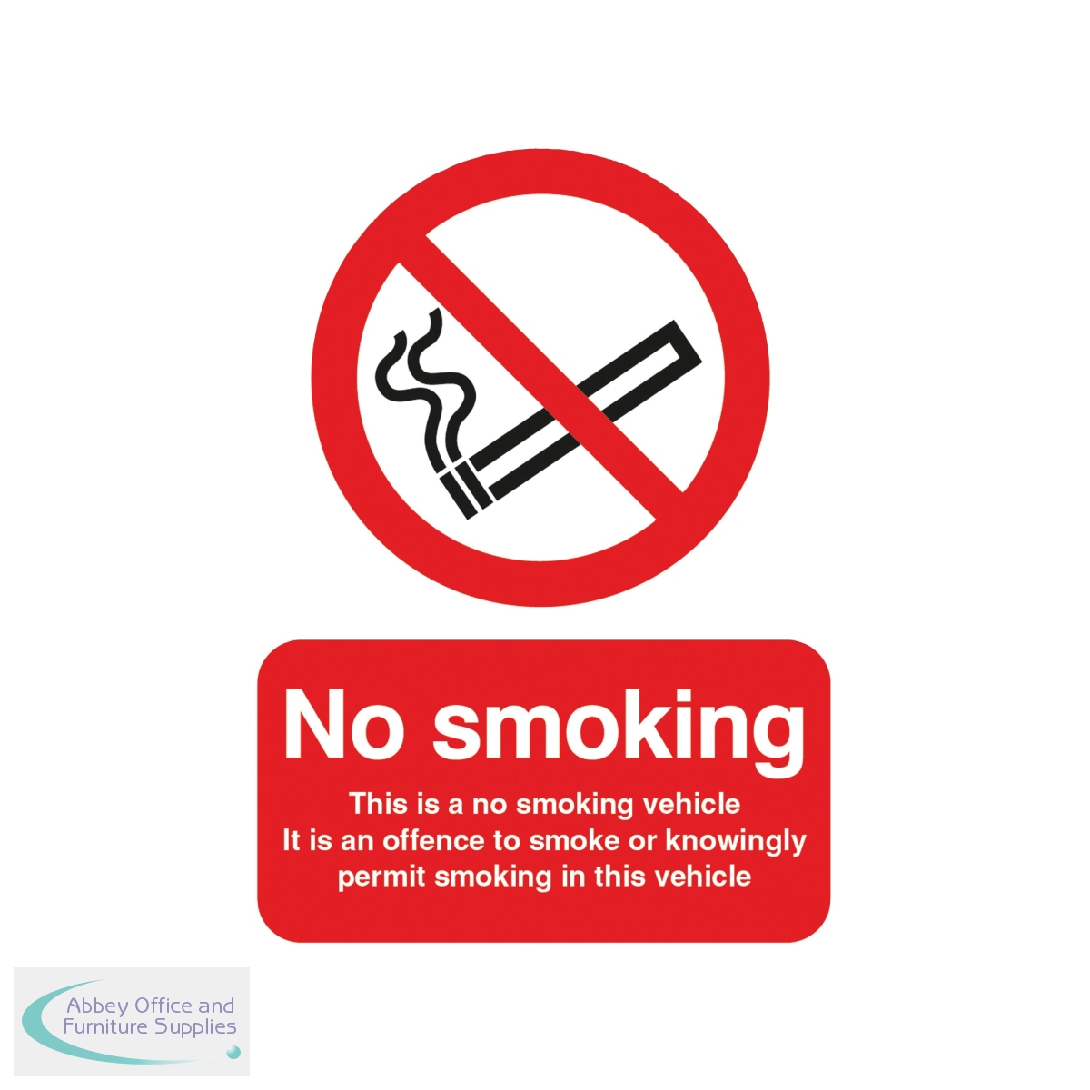 This sign is for use in a vehicle where smoking is prohibited and informs users of legal requirements. The sign uses a universal colour scheme and recognisable symbol, which conforms to BS EN ISO 7010 and is instantly recognisable. This self-adhesive sign measures 100x75mm.