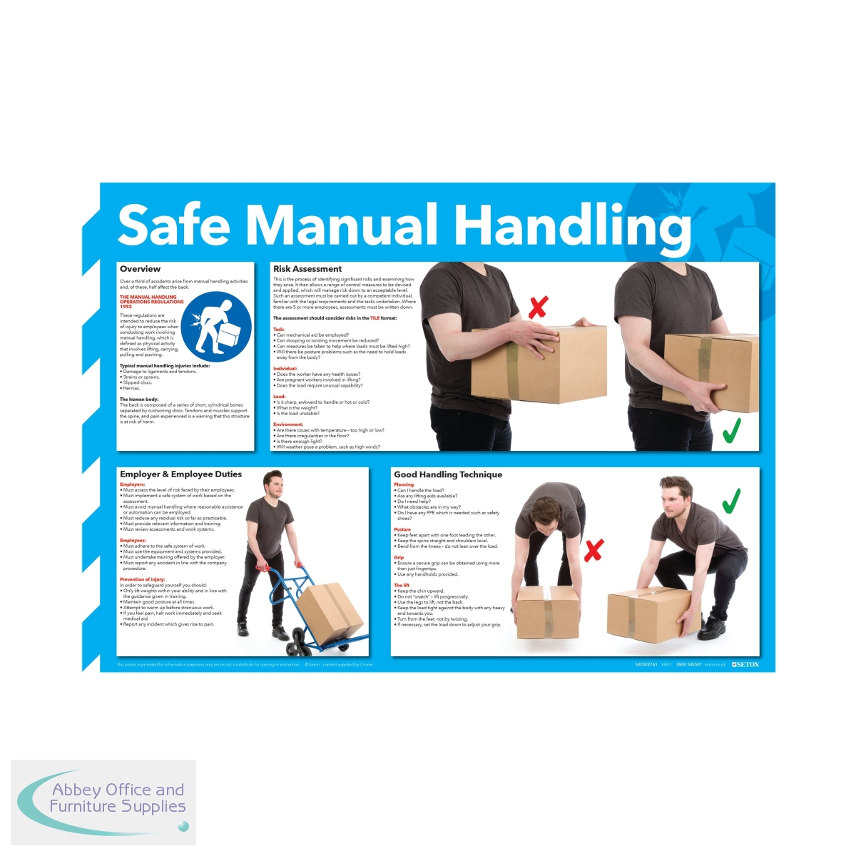 Raise safety awareness throughout your organisation with this safe manual handling wall poster. With clear step-by-step instructions, this sign can help prevent workplace accidents by detailing proper working procedures. Full colour illustrations and clearly defined text illustrate correct manual handling to employees to prevent work related injuies and accidents. Hang as a reference display throughout your building in applicable areas, or use as a training device in manual handling workshops. This poster measures 420x590mm.