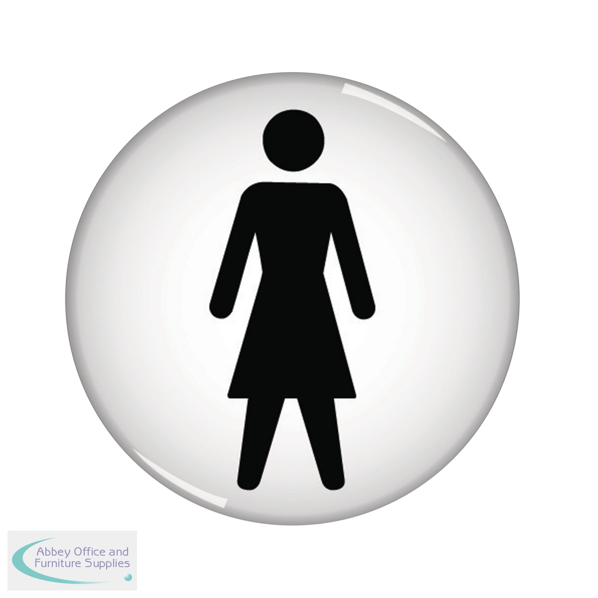 This unique domed sign acts as an indicator for washroom users. This 60mm diameter sign has a self-adhesive backing, allowing easy positioning on or over doors, without the need for tools. The black universal symbol for female washrooms is instantly recognisable and the sign has a stylish white background.