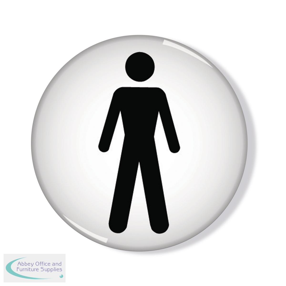 This unique domed sign acts as an indicator for washroom users. This 60mm diameter sign has a self-adhesive backing, allowing easy positioning on or over doors, without the need for tools. The black universal symbol for male washrooms is instantly recognisable and the sign has a stylish white background.