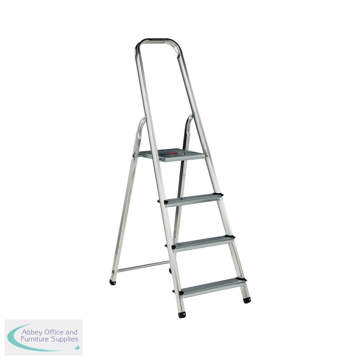 Made from lightweight aluminium and strong steel, this 4 step ladder has a large serrated platform to help you stand comfortably and wide rungs with treads to stop slipping. The platform sits at 770mm above the floor and the ladder is manufactured to EU Industrial standards (EN131). This stepladder will support weight of up to 150kg.