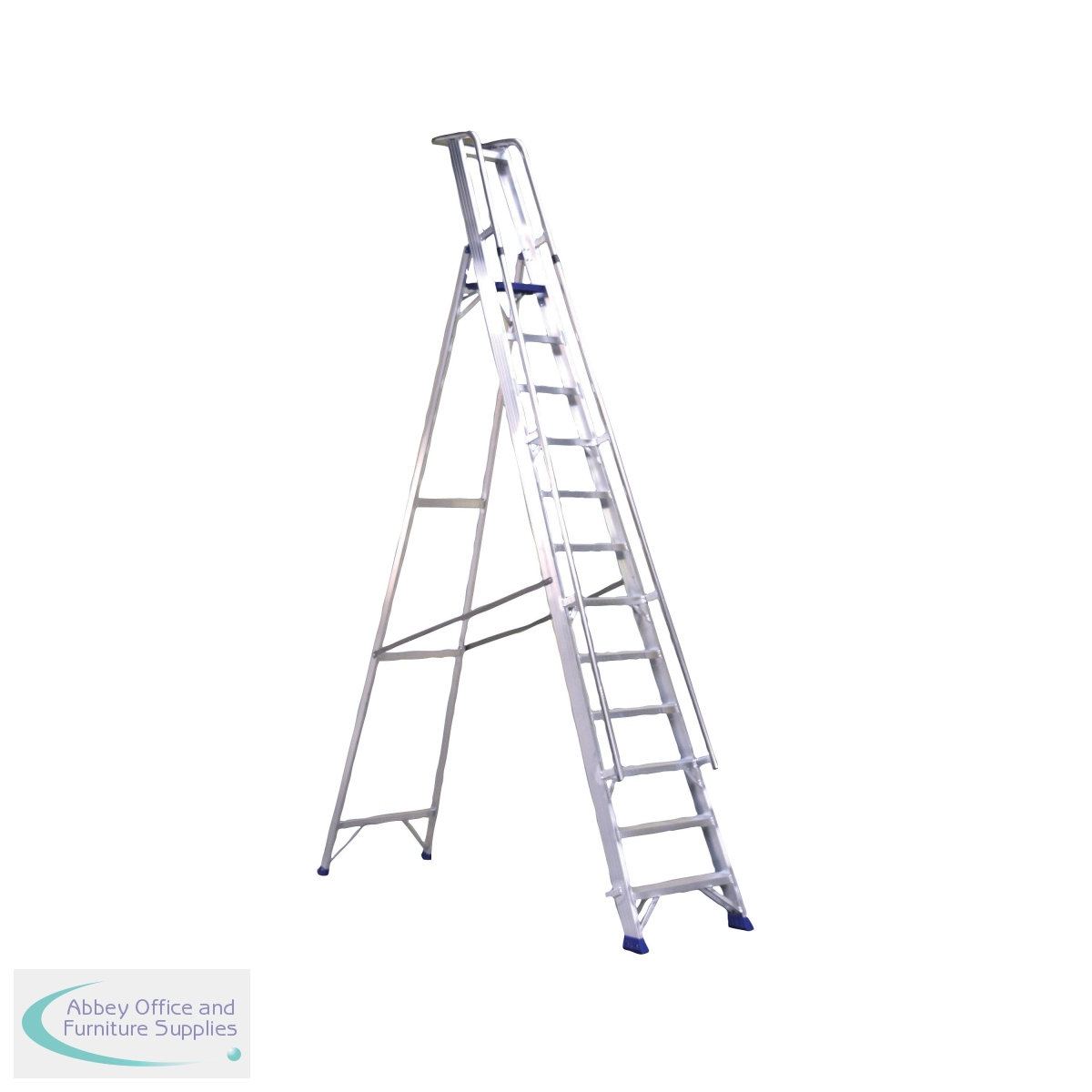 With a strong, welded and ribbed aluminium frame, this 10 step ladder has a large serrated platform, flanged, non-skid steps and a guardrail for safety. The platform sits at 2300mm above the floor and the ladder also features anti-opening straps for transportation when not in use. This stepladder will support a maximum capacity of 150kg.