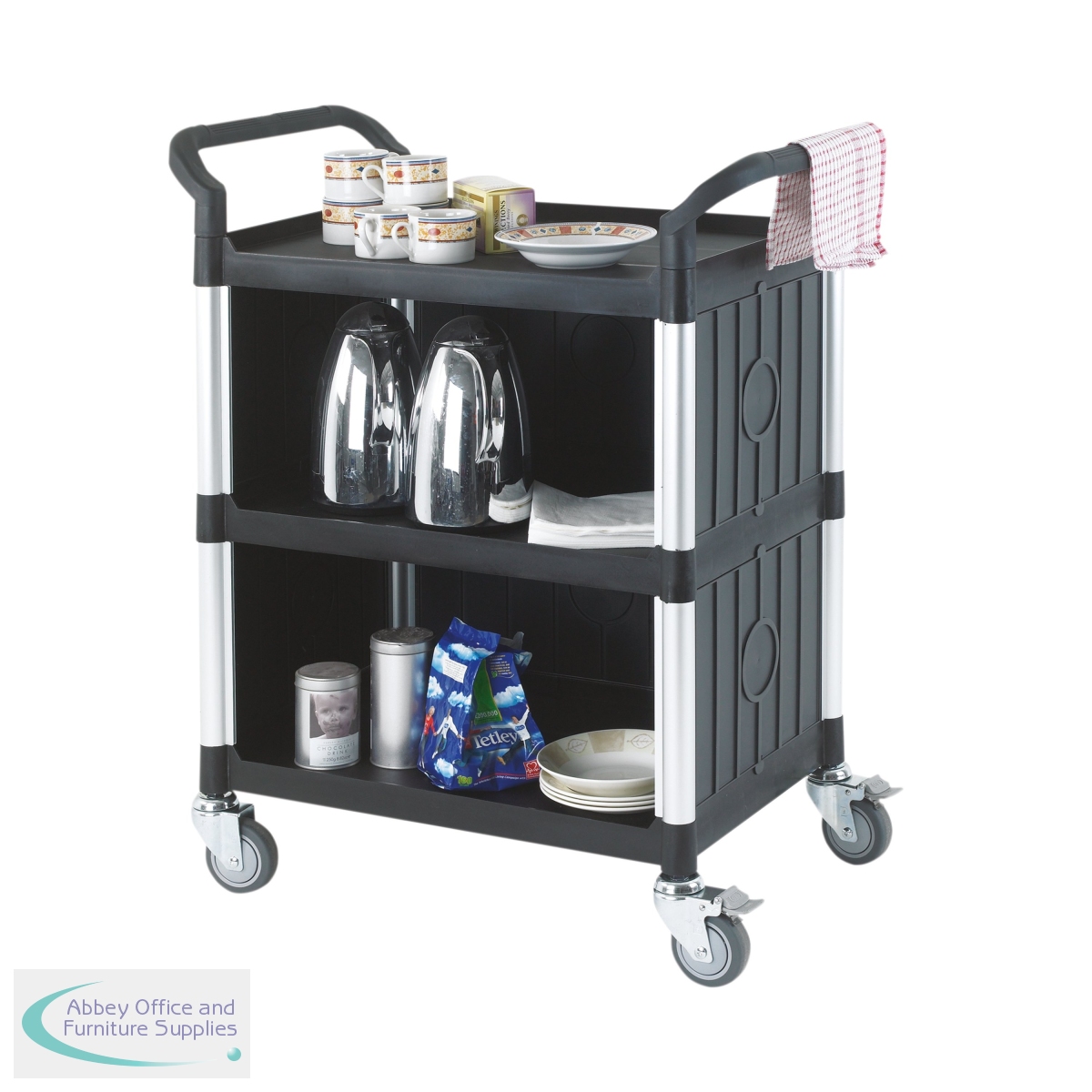 With sleek black sides and a polished chrome finish frame, this trolley makes a great impression and is ideal for front of house use. Fill it up with up to 200kg of catering supplies and it still glides smoothly on the four rubber-tyred swivel castors. The sturdy plastic frame is enclosed on three sides and open on one for easy access to the interior shelves. This trolley sits on 4 x 100mm castors, 2 of which have brakes and measures 750 x 460 x 980mm.