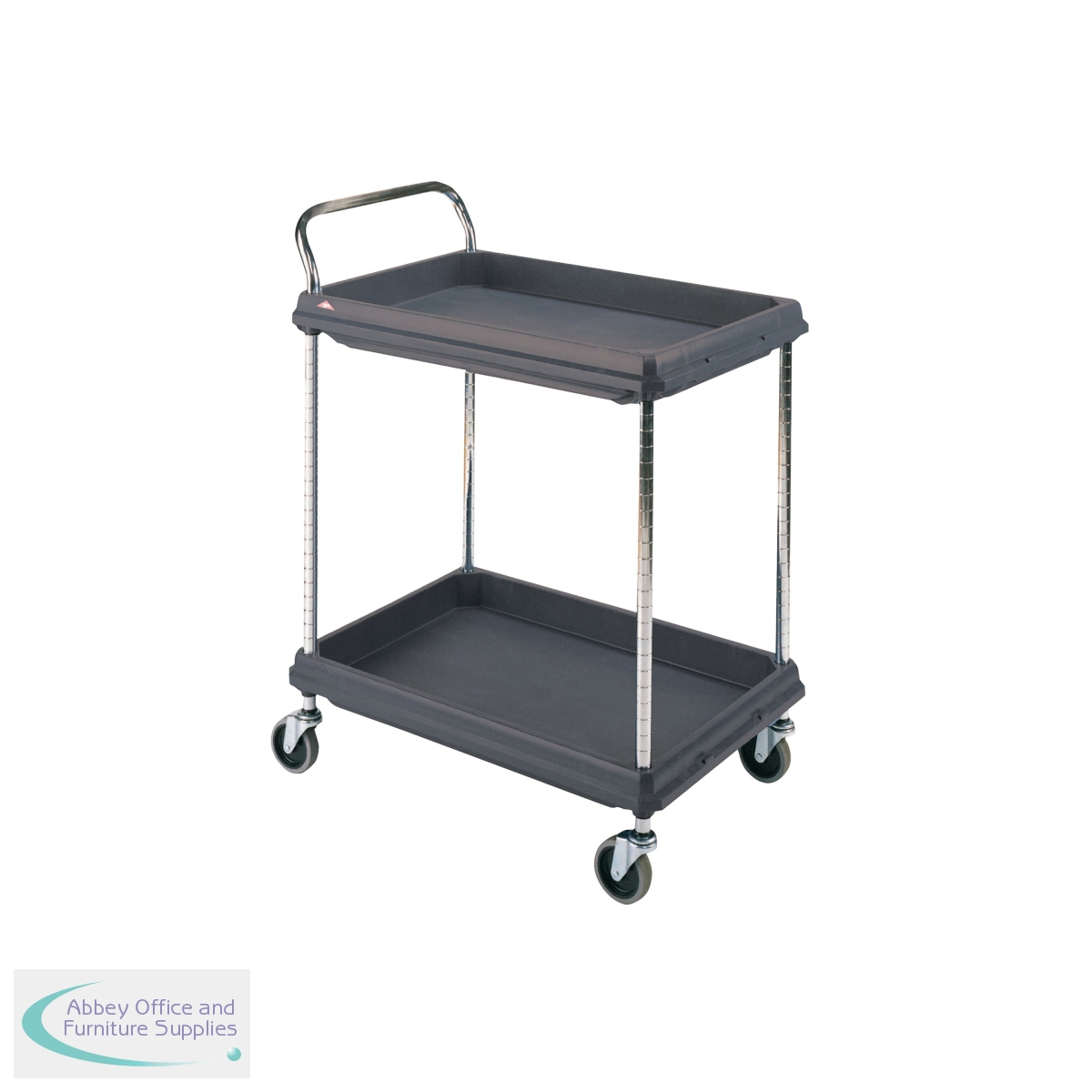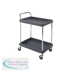 This deep ledged trolley contains 2 shelves with 70mm deep ledges to help contain any spillages and keep items secure during transportation. The smooth, easy to clean polymer surfaces are also impact resistant meaning they won't chip, peel or dent, ideal for multiple uses and purposes. This black 2 tier trolley measures 984x689x1041mm (WxDxH).