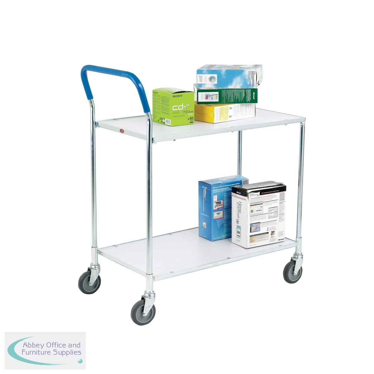 This sturdy and durable trolley has a high quality zinc plated finish and white laminate shelves. The four swivel rubber tyre castors are 100mm in diameter and can withstand a total capacity of up to 150kg. The distance of 510mm between the shelves allows for transportation of tall or multiple items. The plastic coated handle provides a good grip and ease of use. The trolley measures W435 x D850 xH950mm.