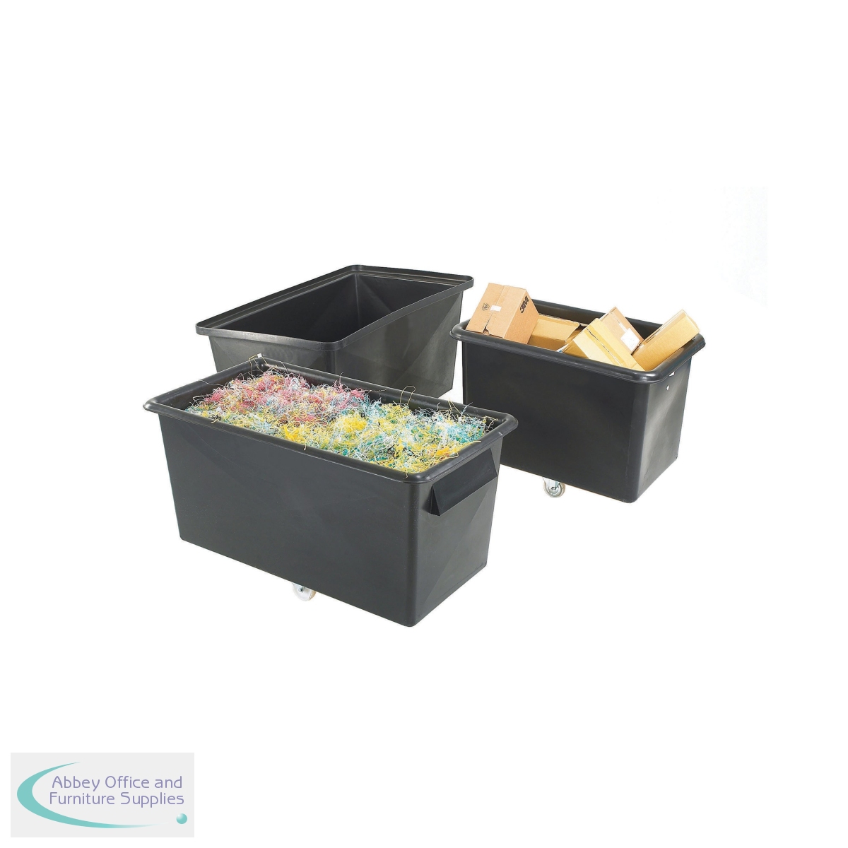 Manufactured from recycled polyethylene, this tough container comes with a plywood base for added strength. Its tapered sides mean it can be stacked with other trucks and stored away when not in use. The container runs on two 75mm, two 100mm fixed nylon castors, fitted in a diamond pattern, and can boast an impressive 307 litre capacity. And with its one piece construction for easy cleaning and ability to withstand temperatures up to 60 degrees Celsius, this container will be of use in any number of environments. (Image shows group shot).