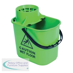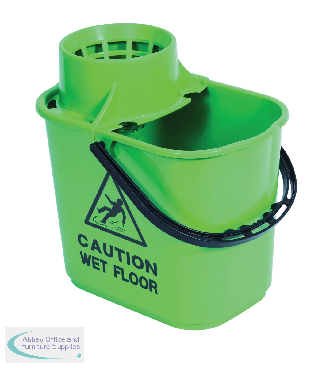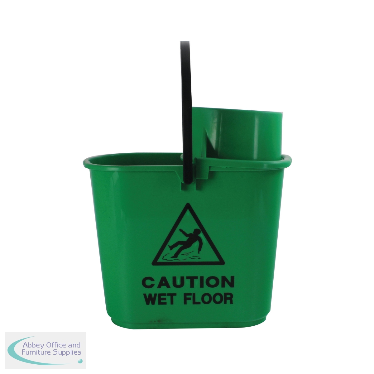 Constructed of robust polypropylene, this mop bucket is strong enough for frequent use when mopping and cleaning. It features a plastic sieve-style wringer for wrenching used water out of your mop, with a channel to carry excess water away to prevent drips. On the side of the bucket, a clear anti-slip warning sign is printed. This pack contains one 15 litre mop bucket with wringer in green, for colour coordinated cleaning.